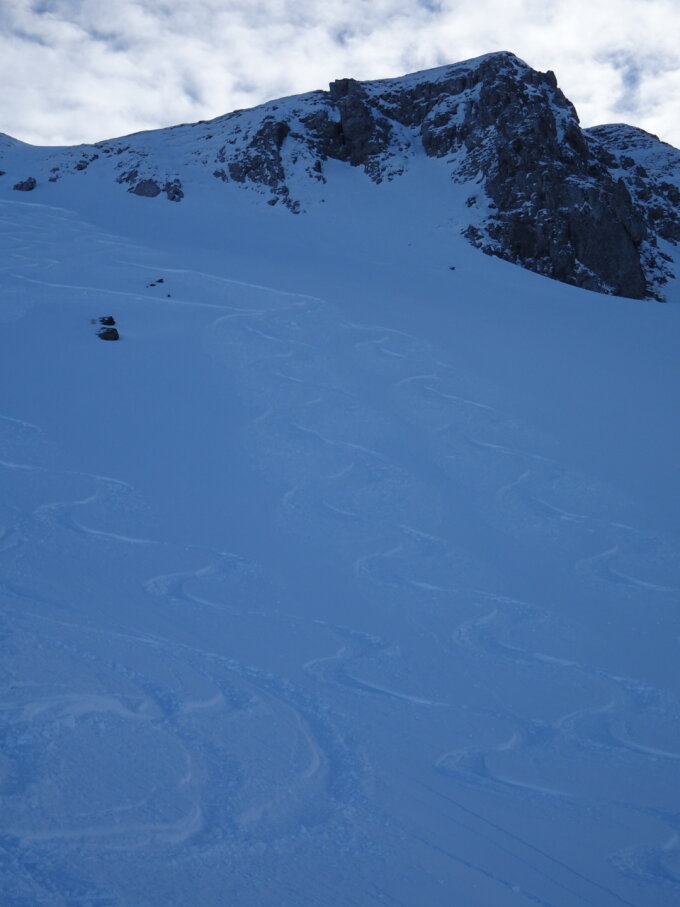 Gute Spur bis zum Felsaufschwung. Dort Skidepot gemacht und zu Fuss einfach auf den Gipfel.