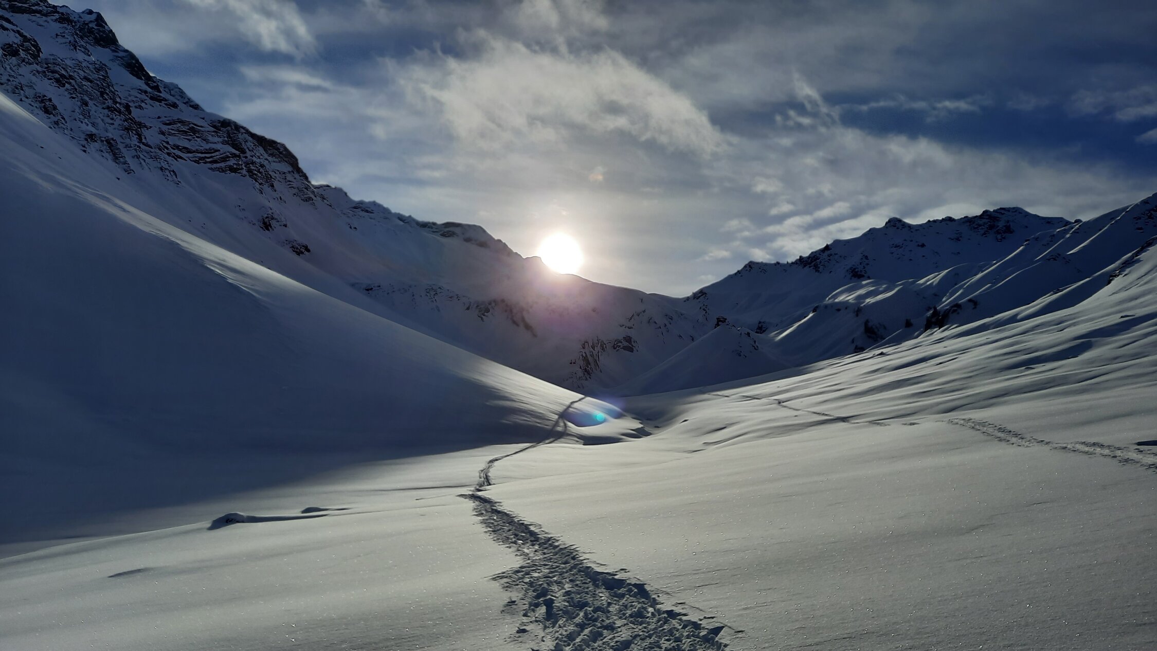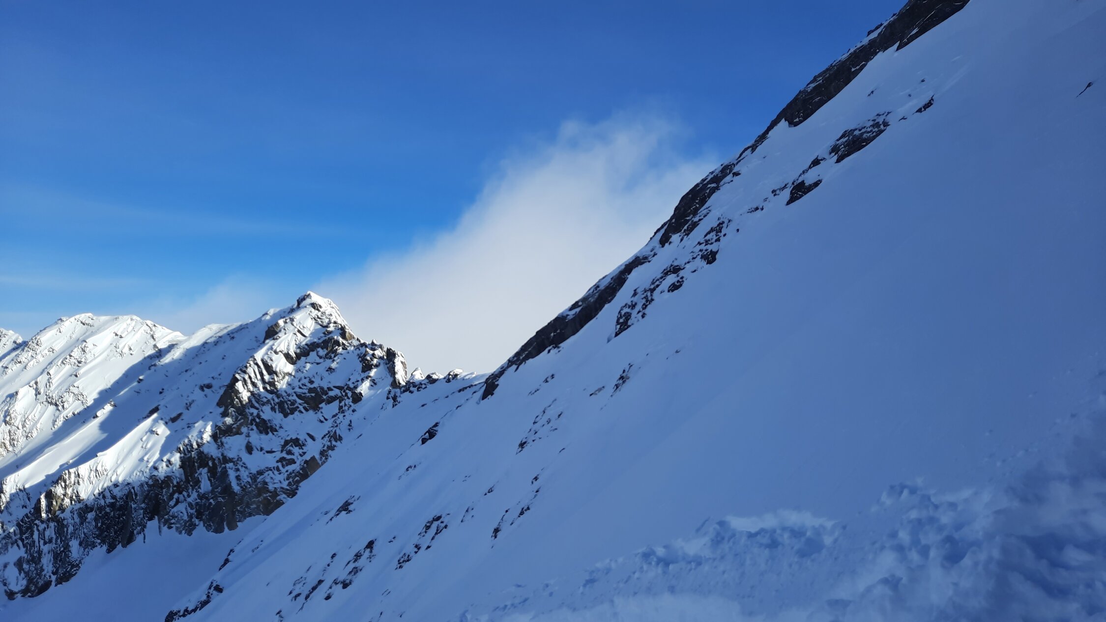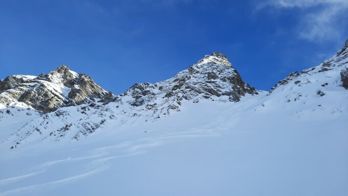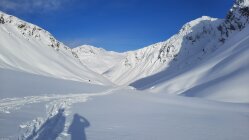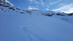 Super Pulver auf dem "Gletscher", stabile Unterlage. Im Steilhang sehr abgeblasen dementsprechend wenig Schnee, viel Stein-/Felskontakt.