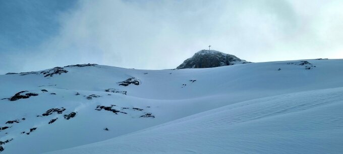 Sehr gute Schneeverhältnisse, teilweise bis zu 50cm Neuschnee in Mulden und kleinen Rinnen, dementsprechend hart war die Spurarbeit. Bis zur ersten Steilstufe vor dem Rachen habe ich von der Spur von 3 Jungs aus Deutschland profitiert, vielen Dank!