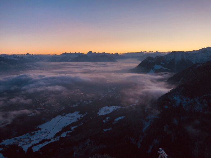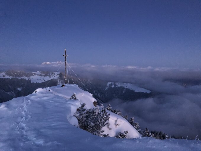Skidepot kurz hinter der Bazoraalpe, da im Wald sehr wenig Schnee liegt. Der Weg bis zum Gipfel ist sehr gut gehbar (und jetzt auch gespurt), und sorgt für ein einsamen Gipfelgenuss :)