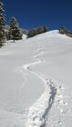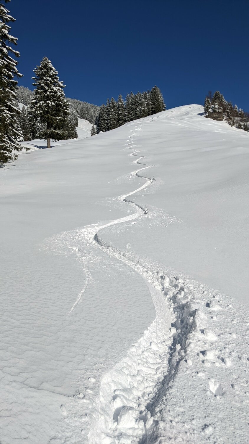 Keine Unterlage, aber ausreichend Schnee, etwas defensive Fahrweise schadet abschnittweise nicht. Meist guter Pulver, unten an den sonnigen Expositionen schon angefeuchtet bzw. leicht decklig, ganz oben im Gipfelbereich von der Bise verblasen.