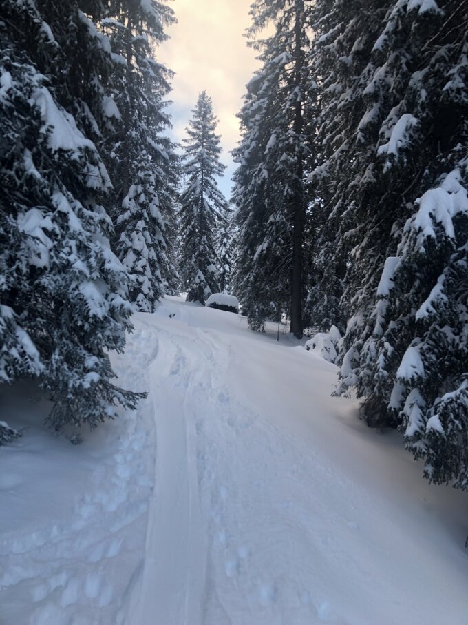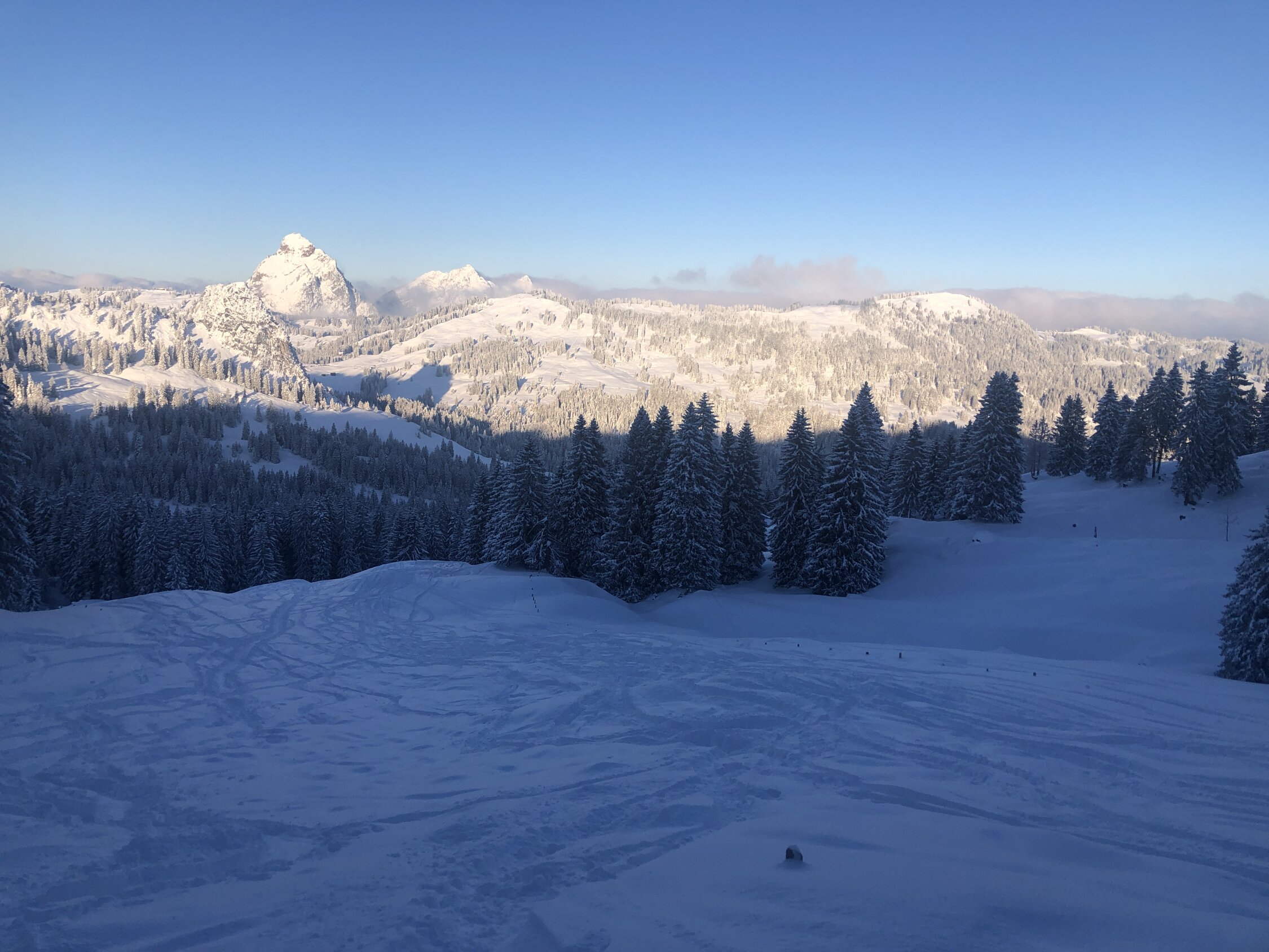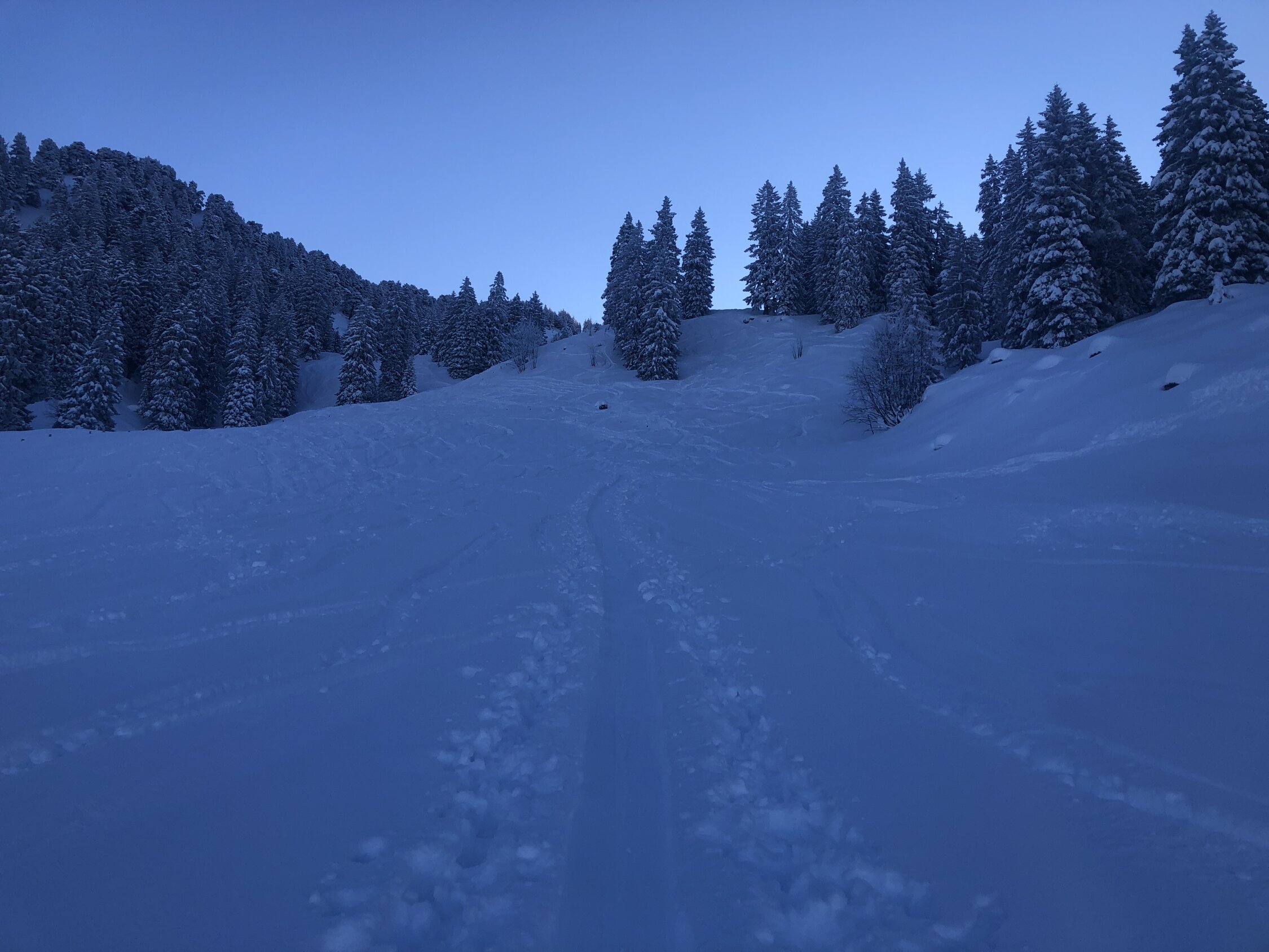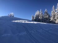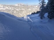Gleich um 8.30 gestartet und damit alleine auf der Tour. Tolle Verhältnisse: hat rund 30 Zentimeter Neuschnee, schönster Pulver, der in der Abfahrt keinen Kontakt mit dem vom Regen vereisten und harten Untergrund zulässt. Wie immer bereits eine gute Aufstiegsspur. In der Abfahrt sah man dann die vielen Gruppen im Aufstieg. Dürfte somit schon ordentlich verfahren sein.