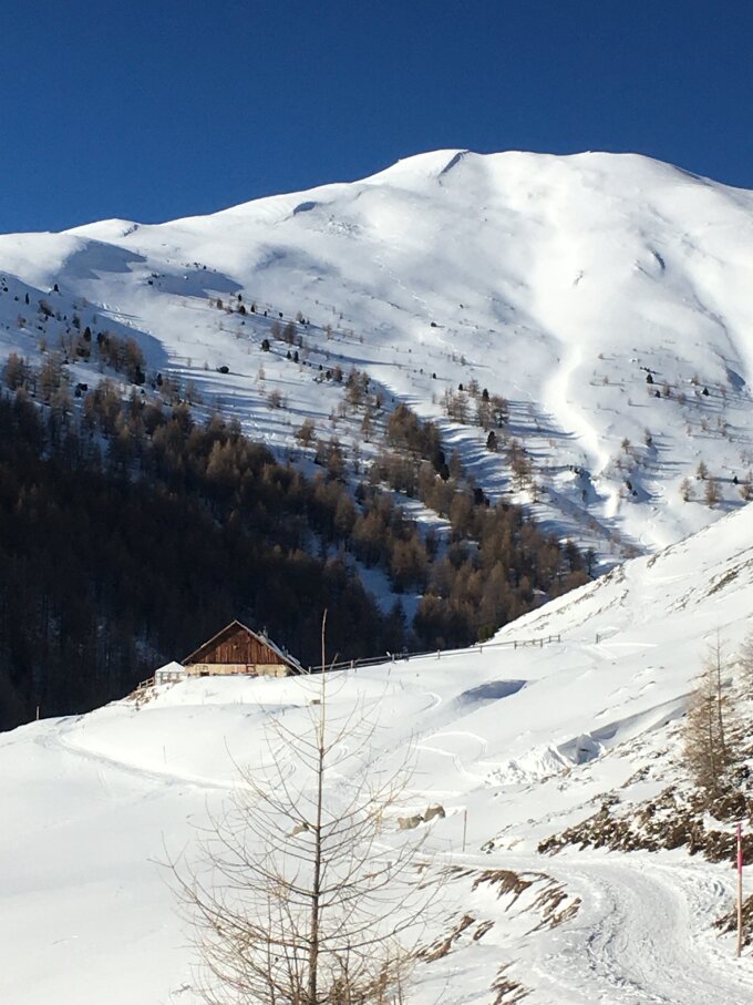 Start Bahnhof Madulain 8.45 Uhr, minus 17 Grad, windstill. Piste auf dem Alpsträsschen bis Alp d´Es-cha Dadour, nachher Schneeschuhspur und Skispur bis auf Rücken Chamanna d´Es-cha. Kurzes Stück ohne Spur. Abfahrt wie Aufstieg, meist Bruchharsch, das Abfahrtsvergnügen hält sich in Grenzen, hie und da etwas Pulverschnee, ab Höhe 2250 m sehr wenig Schnee und einige Eisflächen für etwa 100 Höhenmeter. Ab Höhe 2400 m Abfahrt nicht schlecht. Ab Alp Es-cha Dadour bin ich auf dem Alpsträsschen abgefahren, im Wald und bei den Terrassen zu wenig Schnee vorhanden.