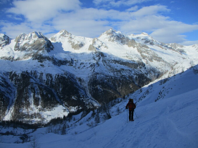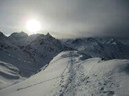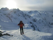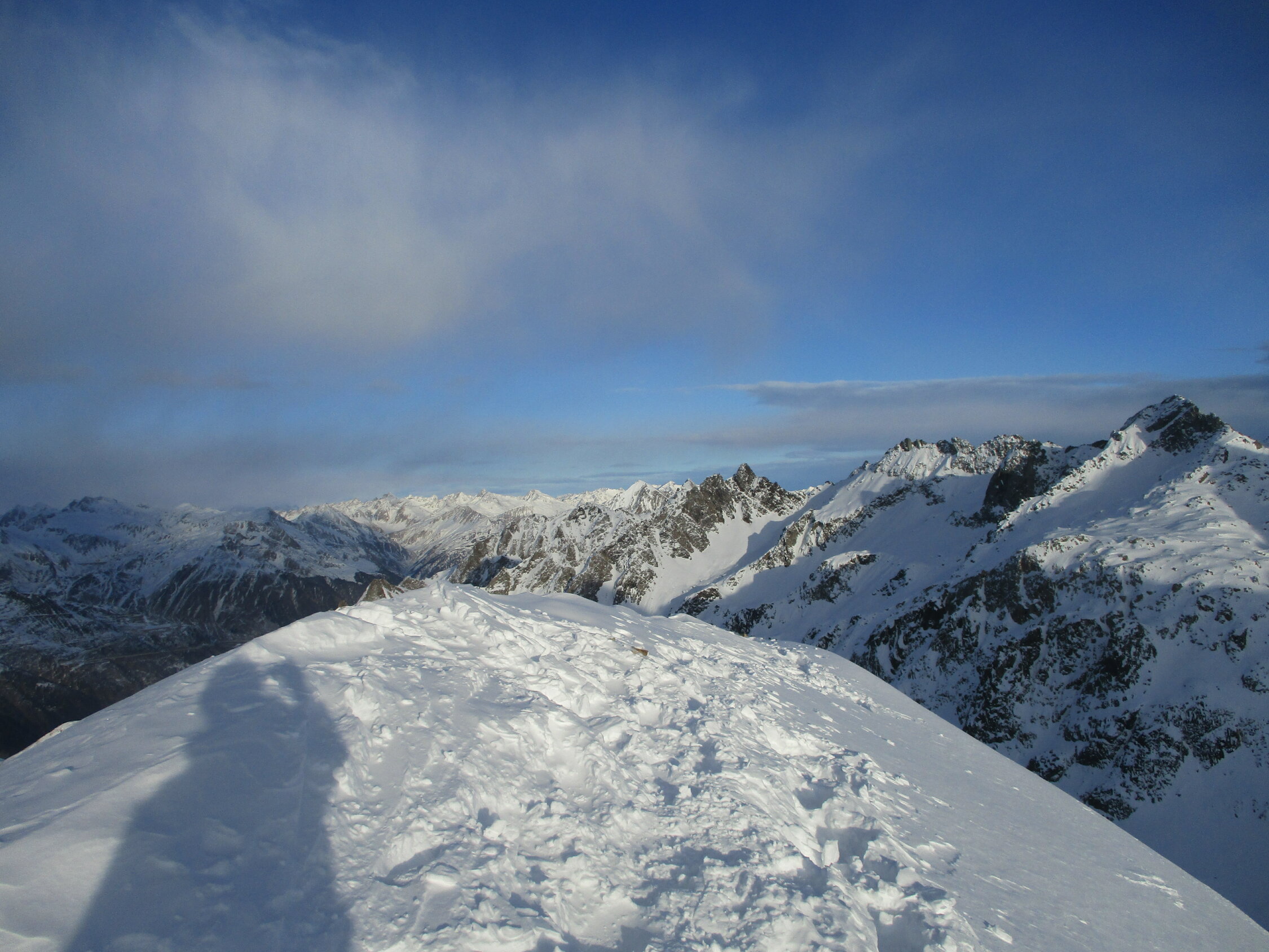 Da wir erst um 12.30 h in All´Acqua los sind, kamen uns im Aufstieg einige abfahrende Skitourengänger entgegen, schlussendlich waren wir dann allein auf dem Gipfel. Nachteil: die Schatten stiegen schneller an als wir, weshalb wir erst knapp unterm Gipfelrücken Sonne abbekamen. Auf dem Gipfel empfing uns ein eiseskalter Föhn, und wir verlegten unsere Vesperpause in einen Windkolk am Fuße des Gipfelrückens.