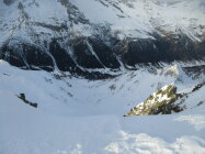 Oberhalb der Waldgrenze schöner Pulver aus den zurückliegenden Neuschneefällen auf zerfahrener Altschneedecke. Bruchharschteilstücke waren allerdings auch vertreten.