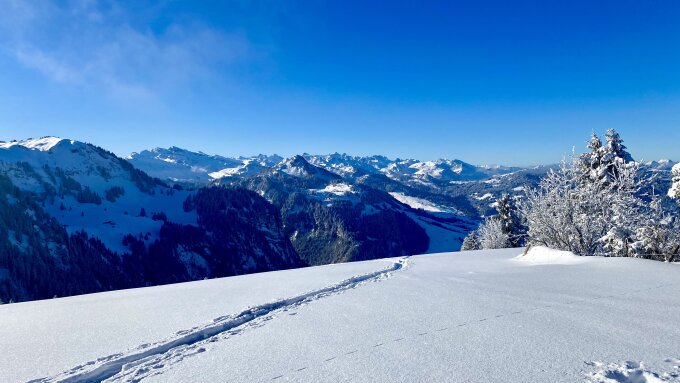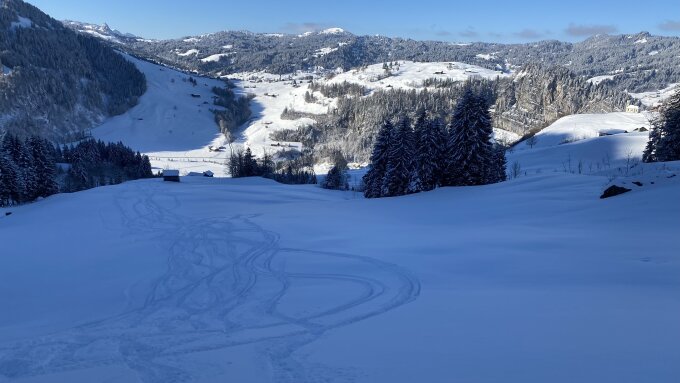 Sehr gute Aufstiegsspur vom Vortag. Dünne Schneedecke aber entlang der Aufstiegsspur sicher fahrbar. Perfekte unberührte Pulverhänge bei der Abfahrt.