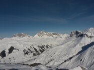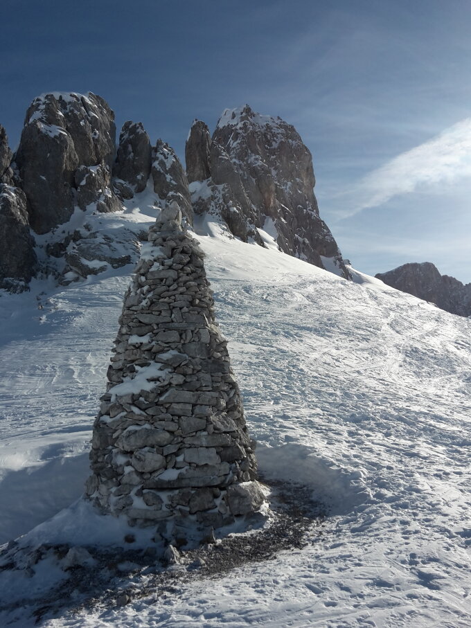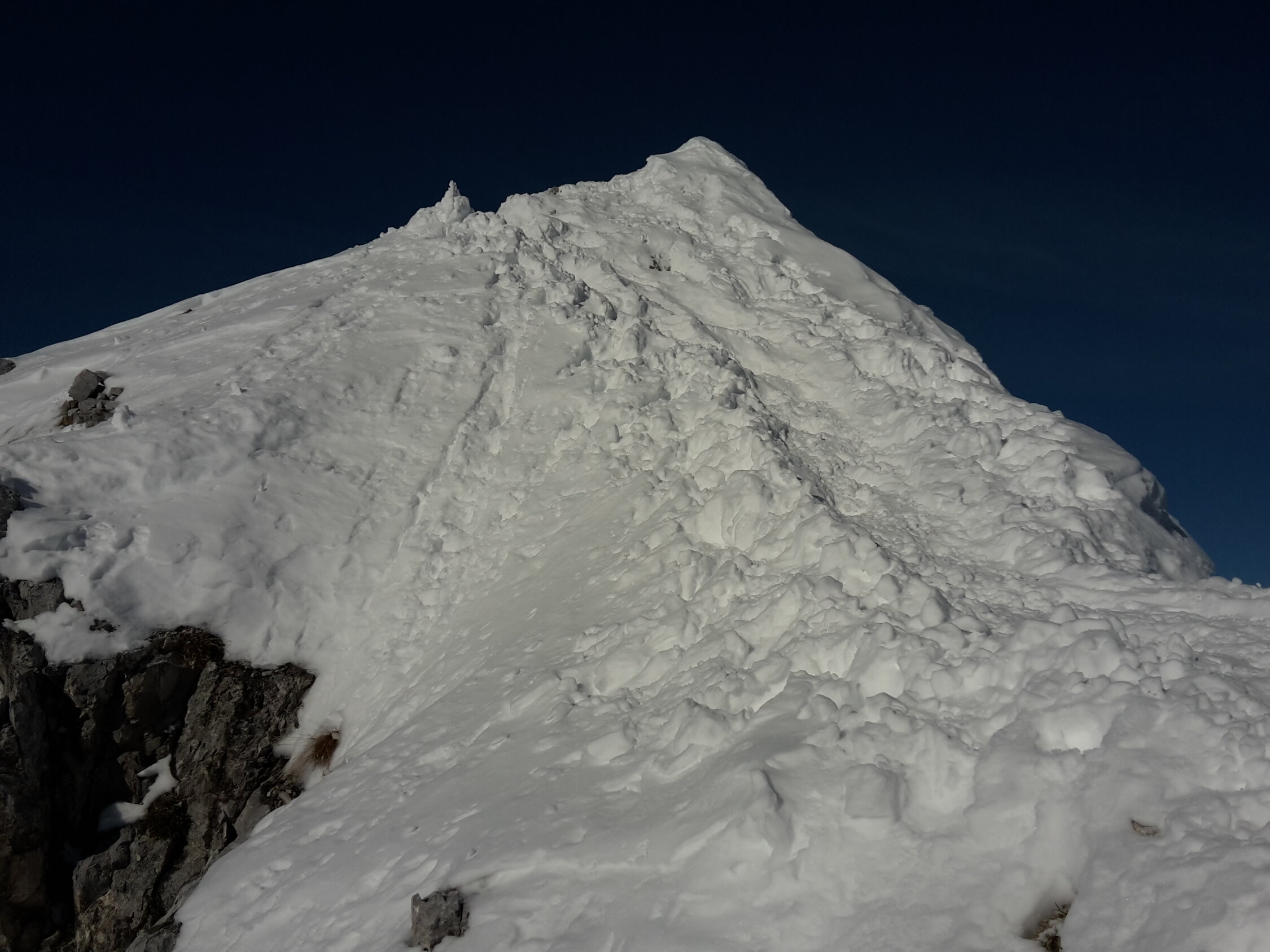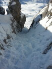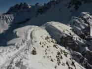 Start um 9:40 in St.Antönien Platz, Fussmarsch in eisiger Kälte bis Parkplatz Rüti. Hurtig hoch auf guter Spur über Engi und dann abseits der Fahrstrasse durch den Wald hoch beim Schlangenstein. Bei Pkt.1853 ist die Spur recht steil. Da noch nicht glasig, keine Harscheisen nötig. Weiter auf umsichtig angelegter Spur hoch zum Luxus-Steinmanndli und weiter bis zur Aufstiegsrinne, Skidepot. Mit Steigeisen durch die Rinne, harter Trittschnee, Grat gut begehbar, Obacht auf die Wechte.