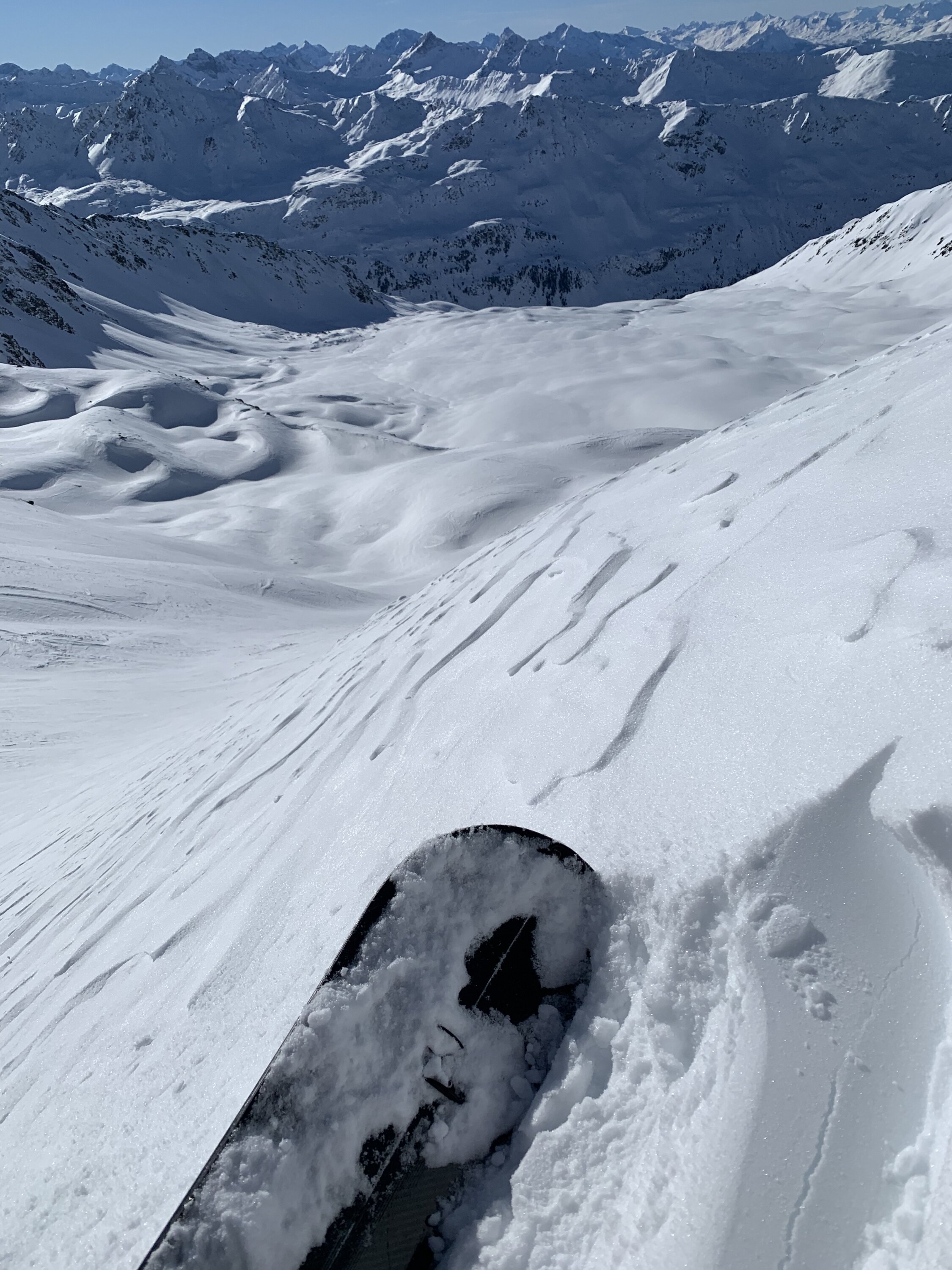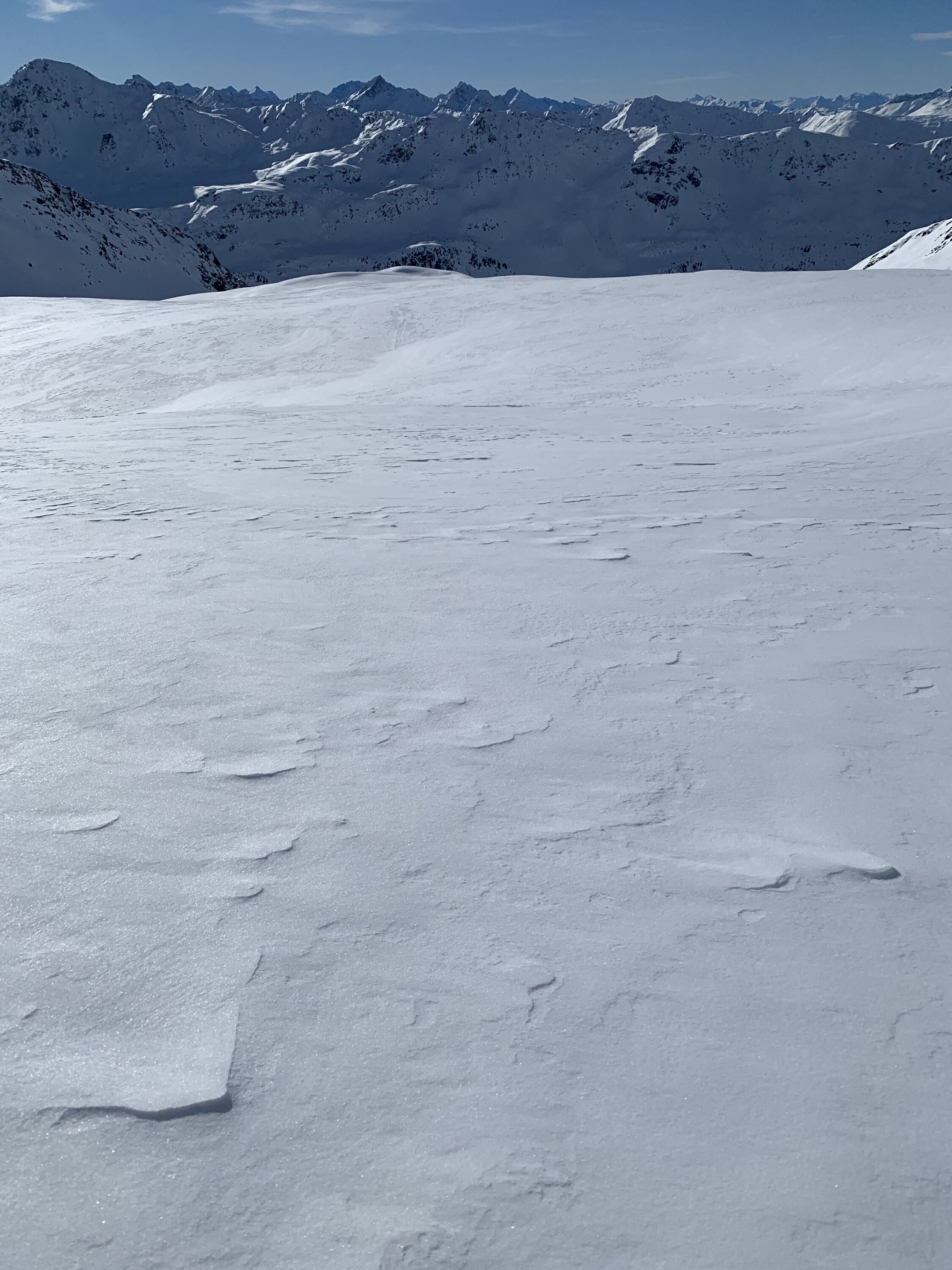 Kalt aber schön. Aufstiegsspur vielseitig und gut. Am Grat abgeblasen und hart. Harscheisen für Splitboarder von Vorteil. Abfahrt via Mattjischtälli. Oberen Teil abgeblasen und schon leichter Deckel vom Wind und Erwärmung. Der wird aktuell nicht besser in der Südseite.