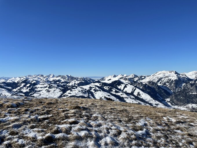 Das „ausgezeichnet“ blendet aus, dass die obersten 100 Höhenmeter bis zum blutte Hubel völlig abgeblasen sind, bis aufs Gras oder die alte Regenkruste. Aber der Aufstieg war insgesamt so schön und die Abfahrt nach Absolvierung der genannten traurigen Gipfelpartie so gut, dass es halt doch zum dunkelgrünen Smiley langte. Die Abfahrt wählte ich via die Osthänge des Niderhorn zwischen ihm selbst und dem Bufal, und das war top! Prima Pulver bis zur Piste, die gerade so genug Schnee hat.
