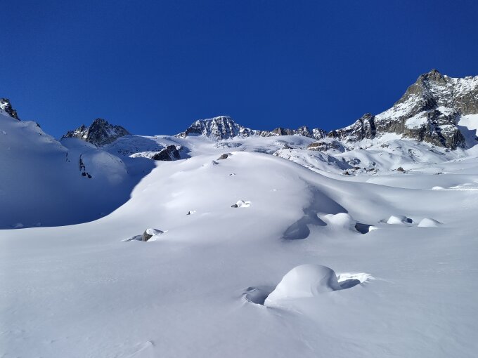 Insgesamt hat es noch nicht ganz so viel Schnee. Mit einer umsichtigen Fahrweise lassen sich Steinkontakte aber gut vermeiden. Mittlerweile gibt es schon recht viele Abfahrtsspuren.