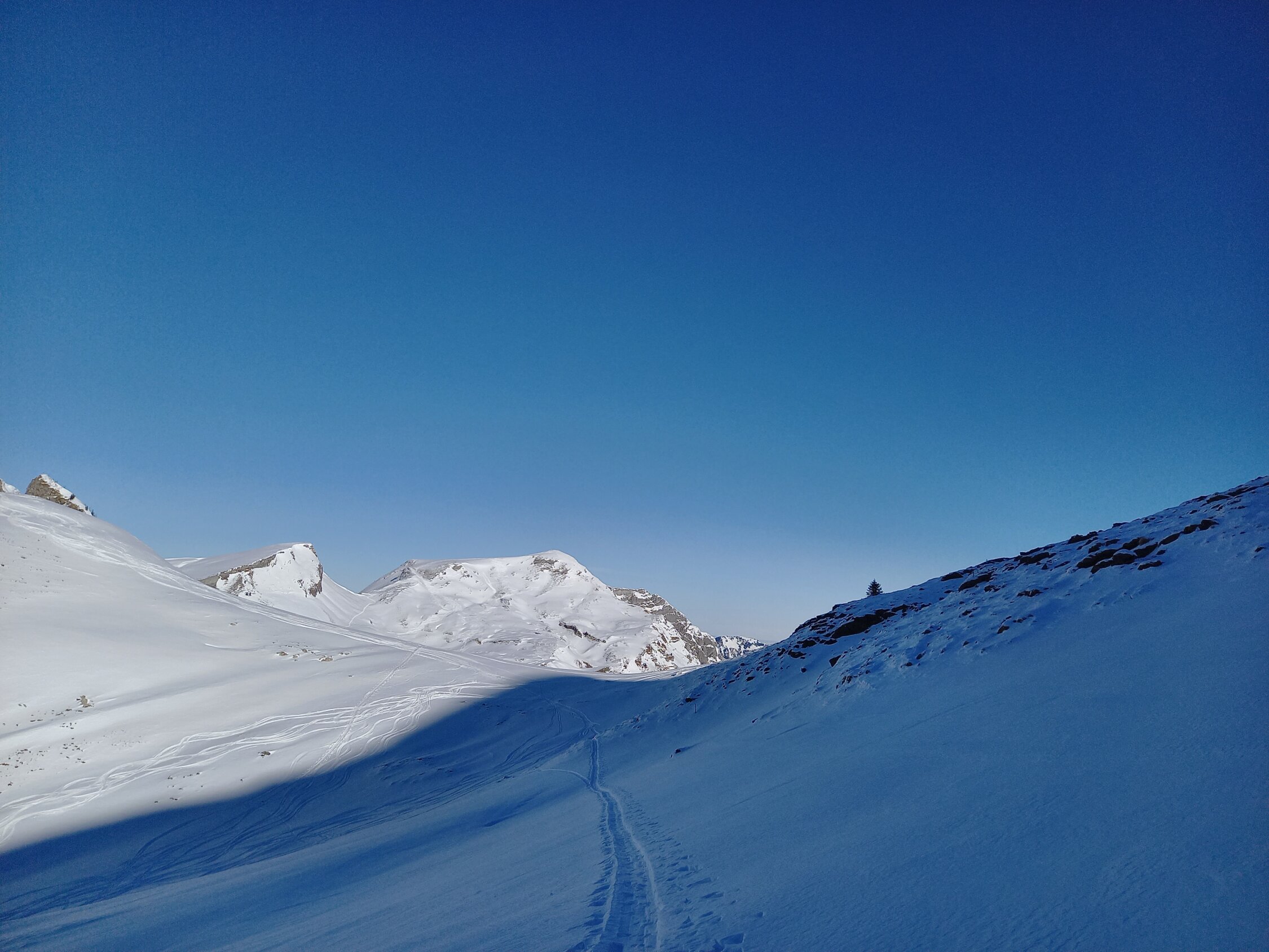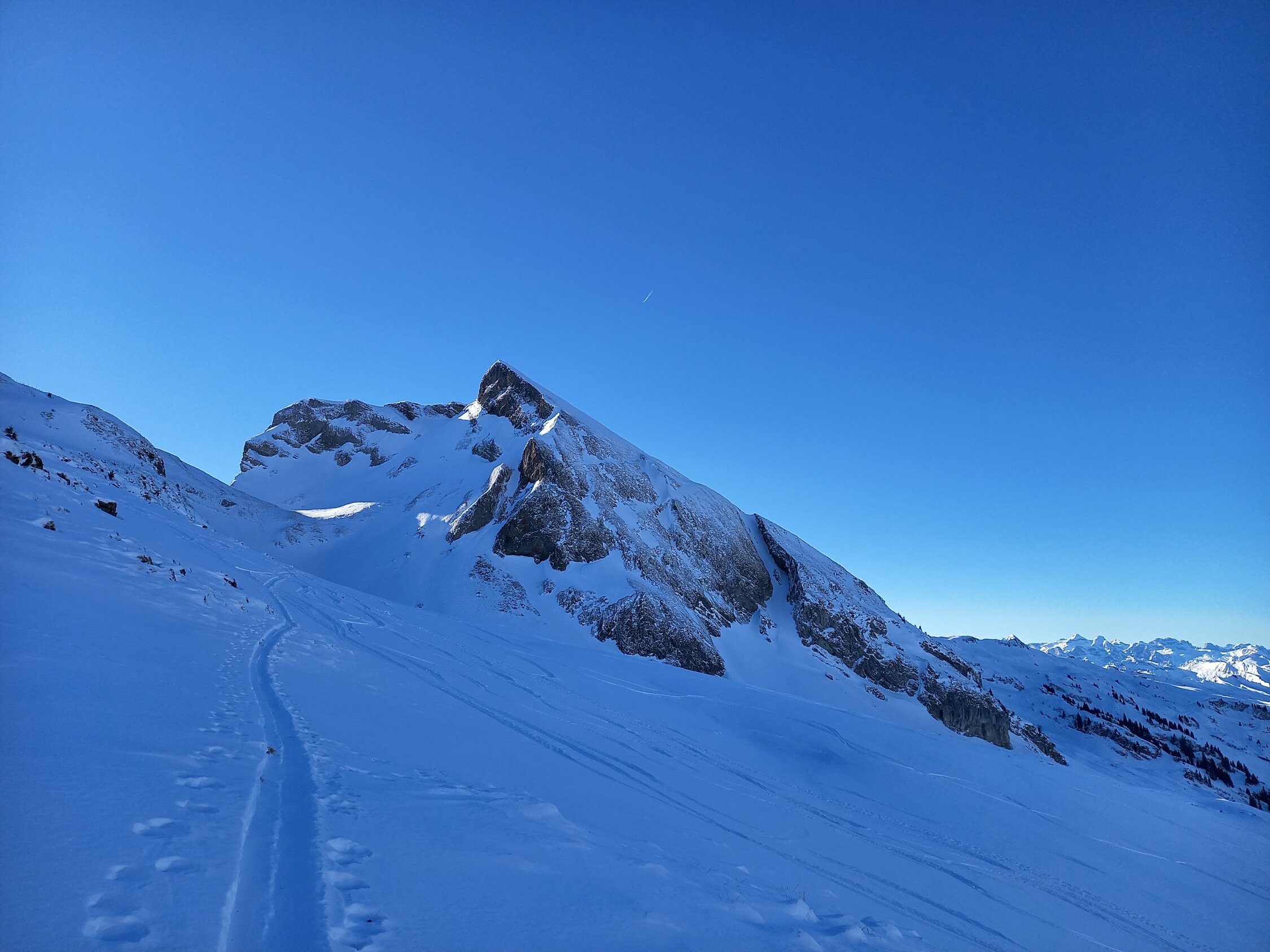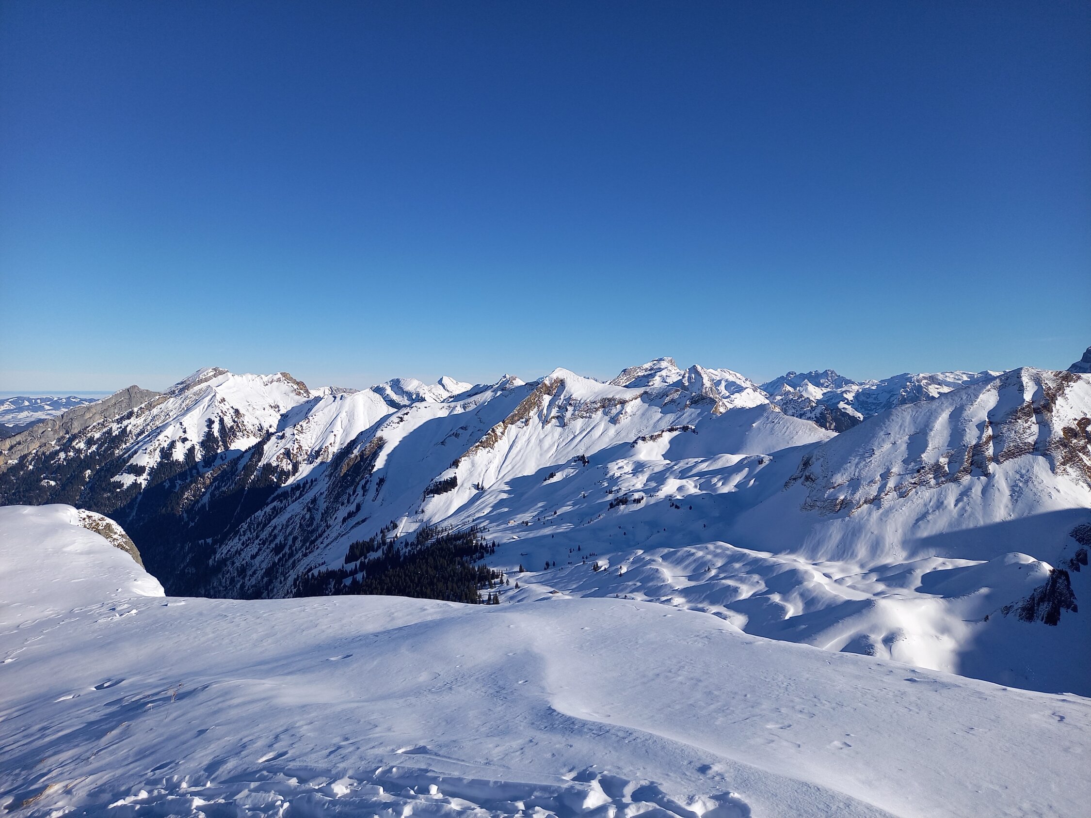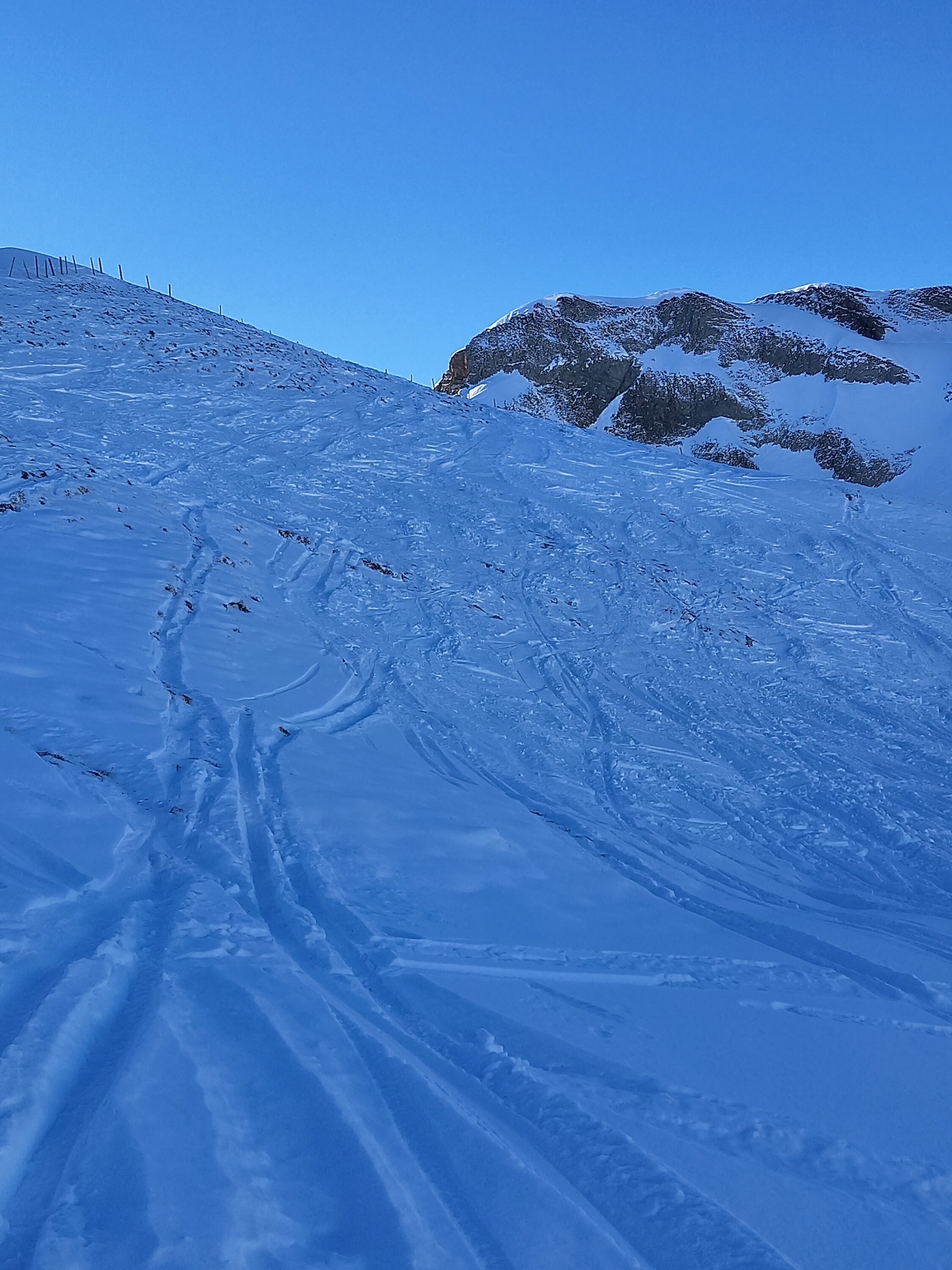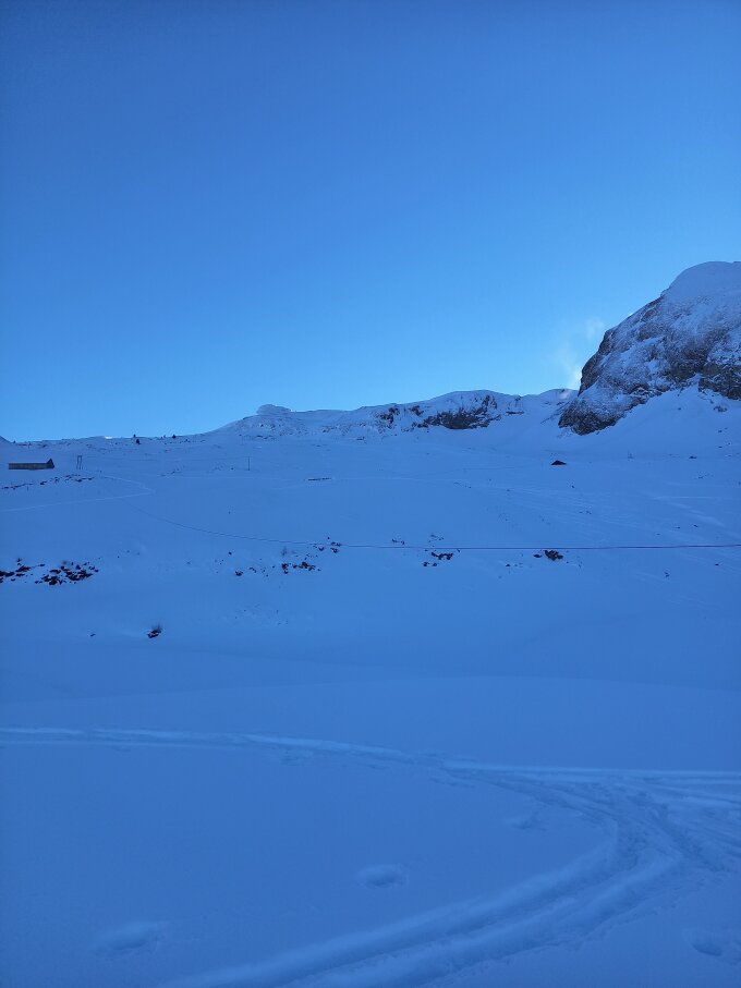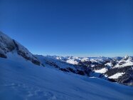 Im Prinzip Pulver von oben bis unten, leider ohne Unterlage, so dass v.a. oberhalb Druesberghütte Steinkontakt auch bei umsichtiger Fahrweise kaum vermeidbar ist. Der oberste Teils des Gipfelhangs ist recht abgeblasen, oberstes Steilstück für die Abfahrt dafür gut eingeschneit. Noch erstaunlich wenig zerfahren und heute auch wenig los (wenn man von zwei Gross-Gruppen mit erstem Ziel Pfannenstöckli absieht).