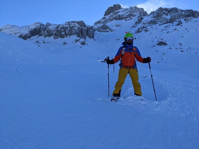 Perfekter Schnee. Es war richtig Kalt und der Schnee war auch im Sonne sehr gut. Es gab schon Triebschnee stellenweise (darum war die Lawinengefahr gemäss Bulleting), aber sonst war die Schneeschicht ziemlich stabil - wir haben die Schneesäule getestet.