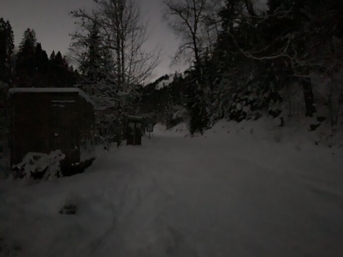 Start ab Parkplatz hinter Säge (ca. 1080 m) um 7:30 Uhr bei -4°C. Strasse mit griffiger Pulverschneeauflage mehr oder weniger gleichmässig festgefahren, pistenähnlich. Kein Eis- oder Fahrbahnkontakt. Ab Ende Panzerpiste weiter auf (sehr gut angelegter, Danke) Solospur (vermutlich vom Vortag) bis zum kleinen Eisfallcouloir. Mit Pickel und Leichtsteigeisen über kurze, vereiste Felsstufe (geht sicher auch ohne) in teils knietiefer Wühlerei etwa 50 Hm nach oben. Again - merci für's Vorspuren an unbekannt. Traverse bereits vom Wind wieder verweht, alte Spur aber immer gut erkennbar. Der frische Pulverschnee liegt - geringfügige Windverfrachtungen fanden statt - gut verbunden auf der eisigen Kruste vom Jahreswechsel. Keine objektiven Gefahren, insbesondere in den steilsten Bereichen zwischen 2200 und 2500 m, erkannt. Letzte 5 m zum Gipfel zu Fuss.