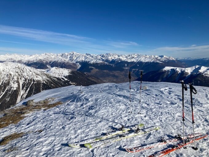Skitourentage im Val Müstair. Schneearm aber sonnenreich. Aufstieg ab Lü der Strasse entlang. Wenig Schnee im ganzen Gebiet, dafür Kaiserwetter. Deswegen ein Gut, denn vom Schnee her wäre ein "Machbar" das höchste der Gefühle. Übler Bruchharst, nur wenige Stellen mit ewas Pulver.