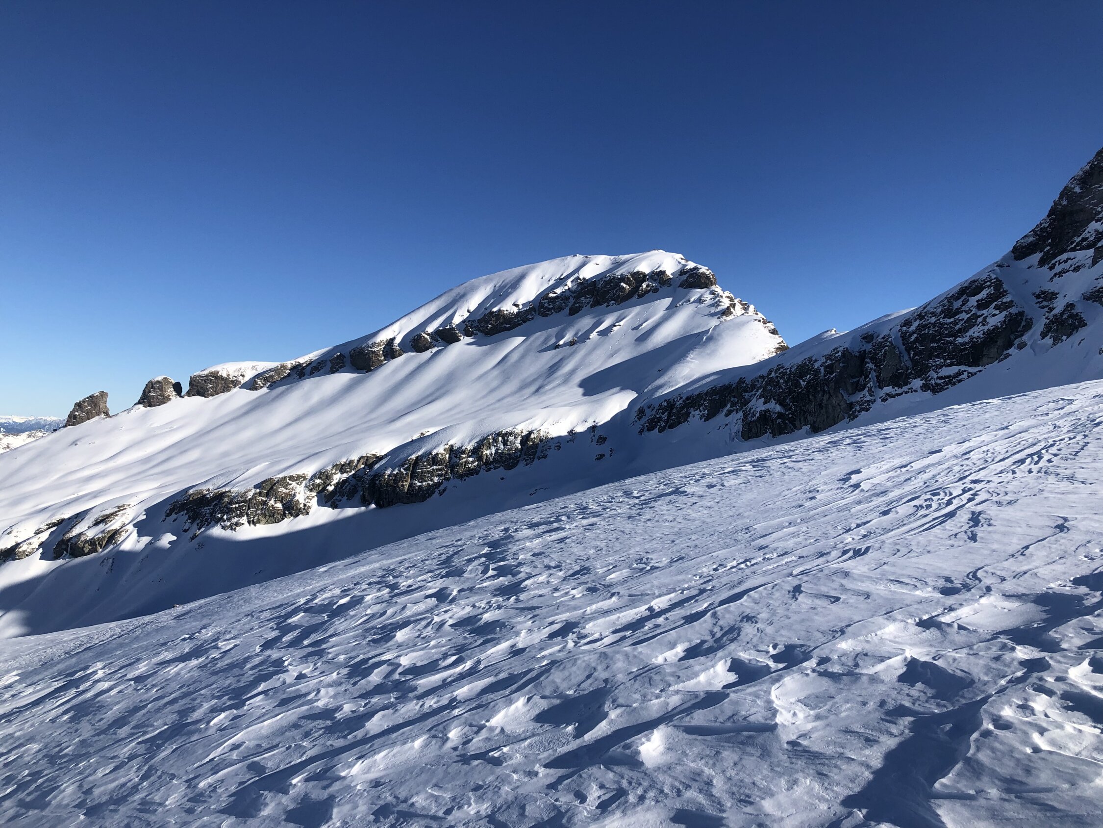 Aufstieg: Bis zum Mittelstafel konnten wir einer guten Spur folgen. Allerdings zieht es sich schon ziemlich bis hierhin, auch wenn es auf der Karte straight-forward ausschaut. Ab hier war Spuren angesagt. Da die Sonne im oberen Teil einheizte, wurde der Schnee klebrig, stolliger Schnee sorgte für dicke Beine heute. Hoch bis zum Pt. 2412, hier ist die Tour noch nicht zu Ende, es folgt eine schattige Traverse und zwei Couloirs, beide mit Skis begehbar. Schlussendlich brauchten wir gute 5h auf den Gipfel, und dies bei eigentlich guter Grundkondition.