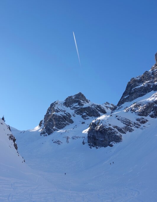 Tour aktuell eher für Nachtschattengewächse als für SonnenanbeterInnen. Sonnenbrille braucht es erst auf dem Gipfel. Waldweg bis Abzweigung ins Wildgrimmi "gepistet". Gipfelhang teilweise windgepresster Pulver. Aufstiegsspur in der ersten Steilstufe etwas sportlich steil, dafür super schön angelegte Aufstiegsspur im Gipfelhang!