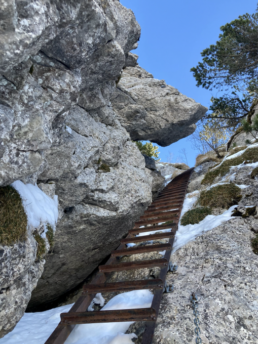 Von dort ungefähr dem Wanderweg entlang bis ca. 50hm unter der Leiter wo ich Skidepot machte. Guter Trittschnee bis zur Leiter und auch diese ging relativ leicht. Zeitbedarf rund 1.5h.