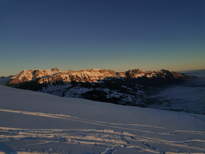 Start um 8 Uhr beim Berghaus. Tolle Morgenstimmung. Die Piste hoch, durch den Wald (jetzt keine Tragestelle mehr), unter Hanenspil queren (Schnee wird stellenweise etwas knapp, Spur etwas glasig und schräg, nicht so toll für Splitboarder), weiter bis Pkt. 1959 und ab da südlich Richtung Fulfirst abzweigen. Gut angelegte Spur im Gipfelhang, keine Harscheisen nötig. Skidepot und weiter mit Steigeisen und Pickel. Der letzte Abschnitt ab dem obersten "Sattel" ist aper, mit stellenweise etwas Eis, Obacht man kann tief fallen! Tolle Aussicht. Abstieg zum Skidepot und Aufstieg zum Chli Fulfirst (yours truly hat am Grat gekniffen, die Splitboard-Begleitung hat den ausgesetzen Grat sehr gut gemeistert). Abfahrt bis Schäferhütte auf arg zerfahrenem aber trotzdem angenehmen Pulver. Marchenböden und Hasenwald ok, aber sehr zerfahren und ruppig, aber nicht hart wie vor 2 Wochen.