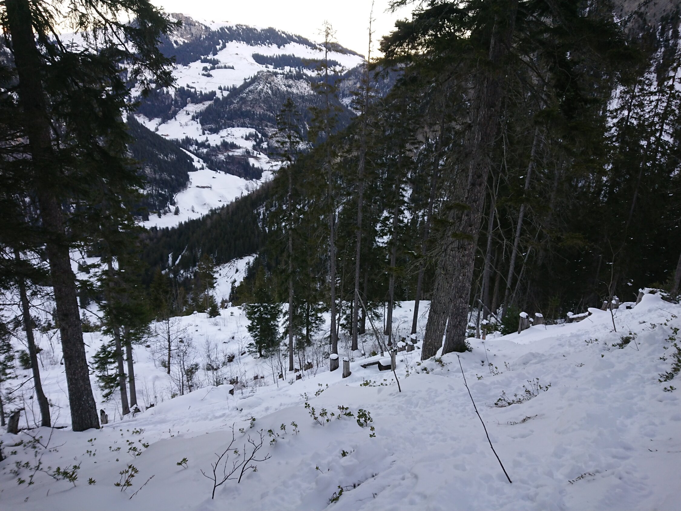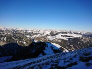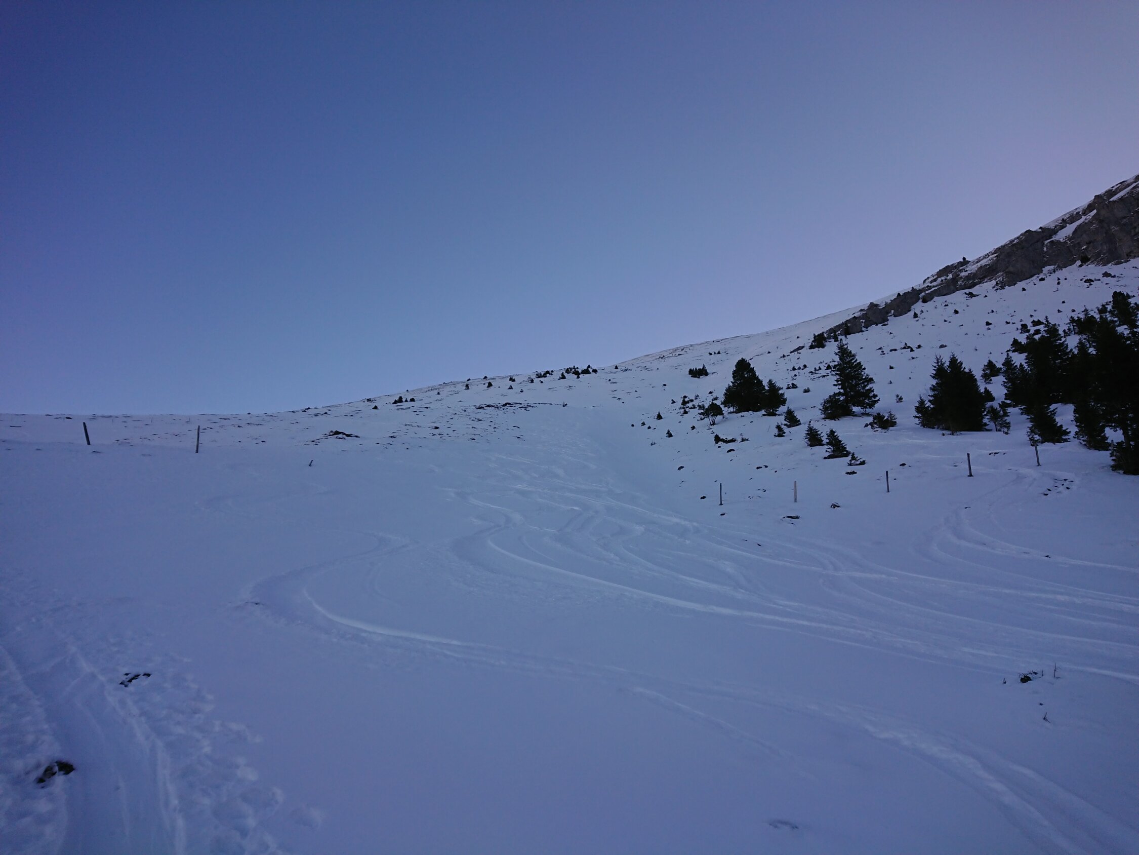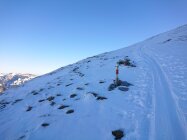 Pulver ohne Unterlage. Oberhalb der Alp Wirie sehr abgeblasen. Aufstieg teils mühsam, die Felle rutschen durch. Die Abfahrt durch die Mulde am Gipfelhang war ganz passabel und heute der beste Teil. Mit ordentlich Steinkontakt ist zu rechnen, insbesondere unterhalb der Alp ist Vorsicht geboten.