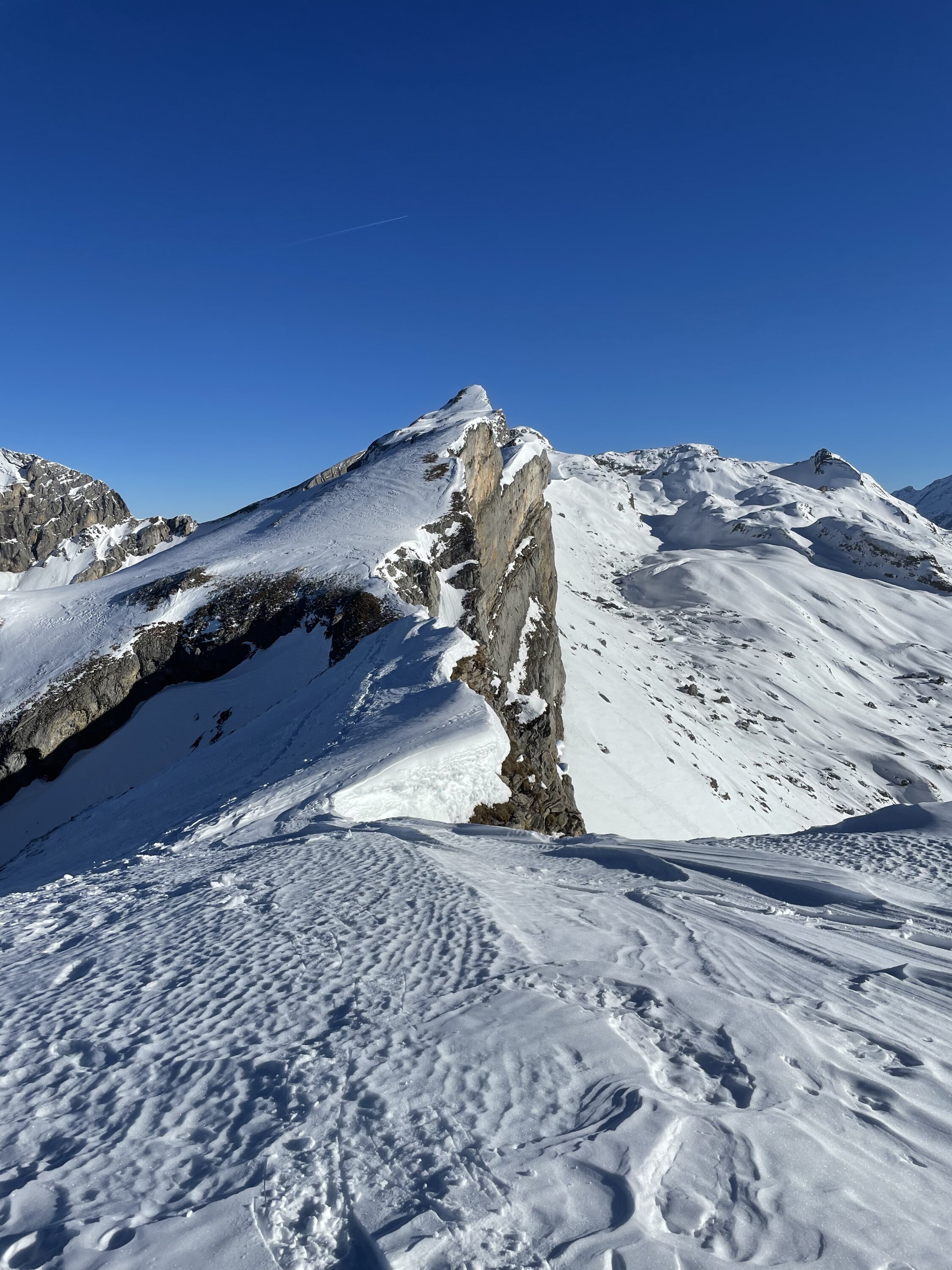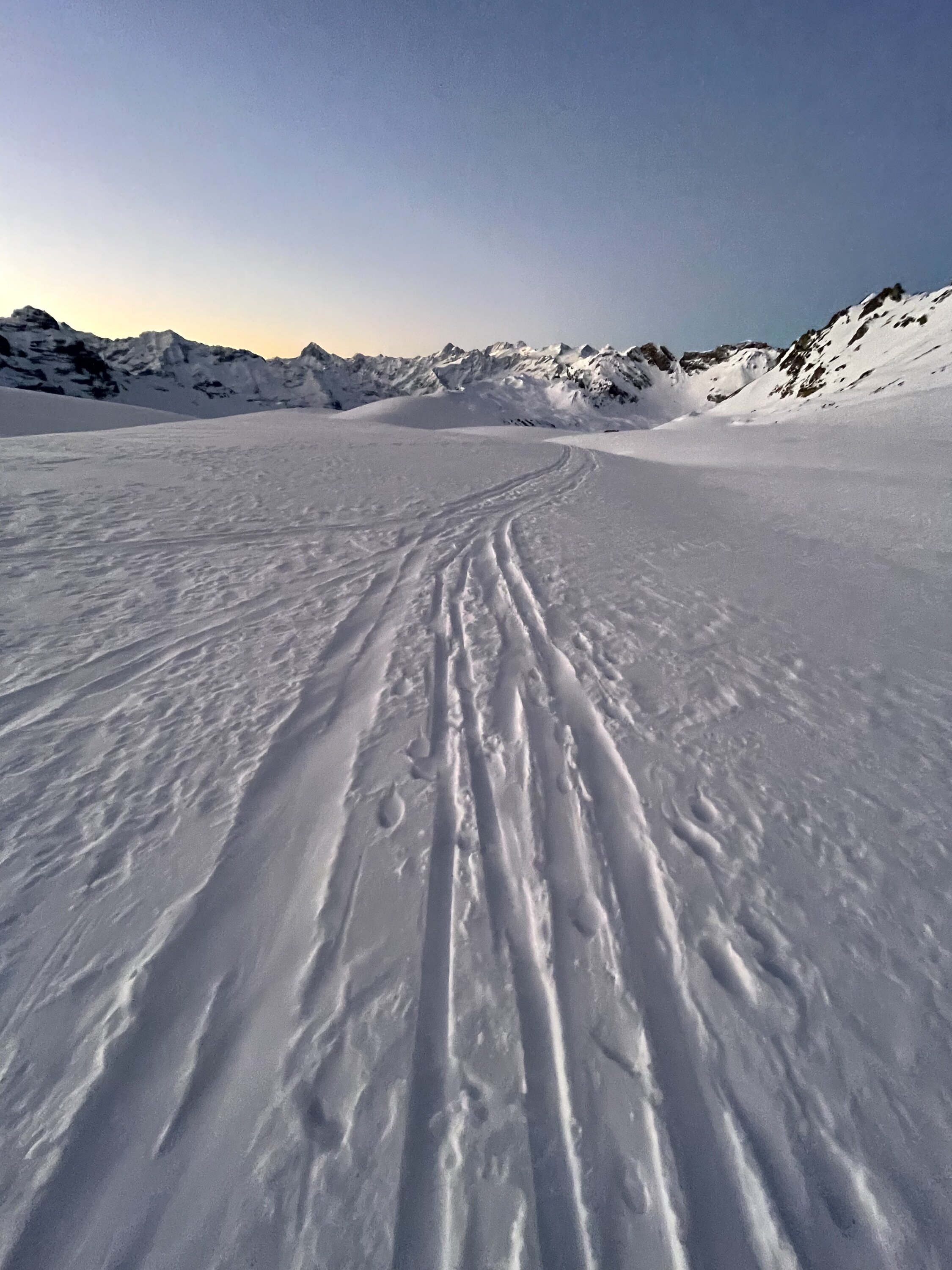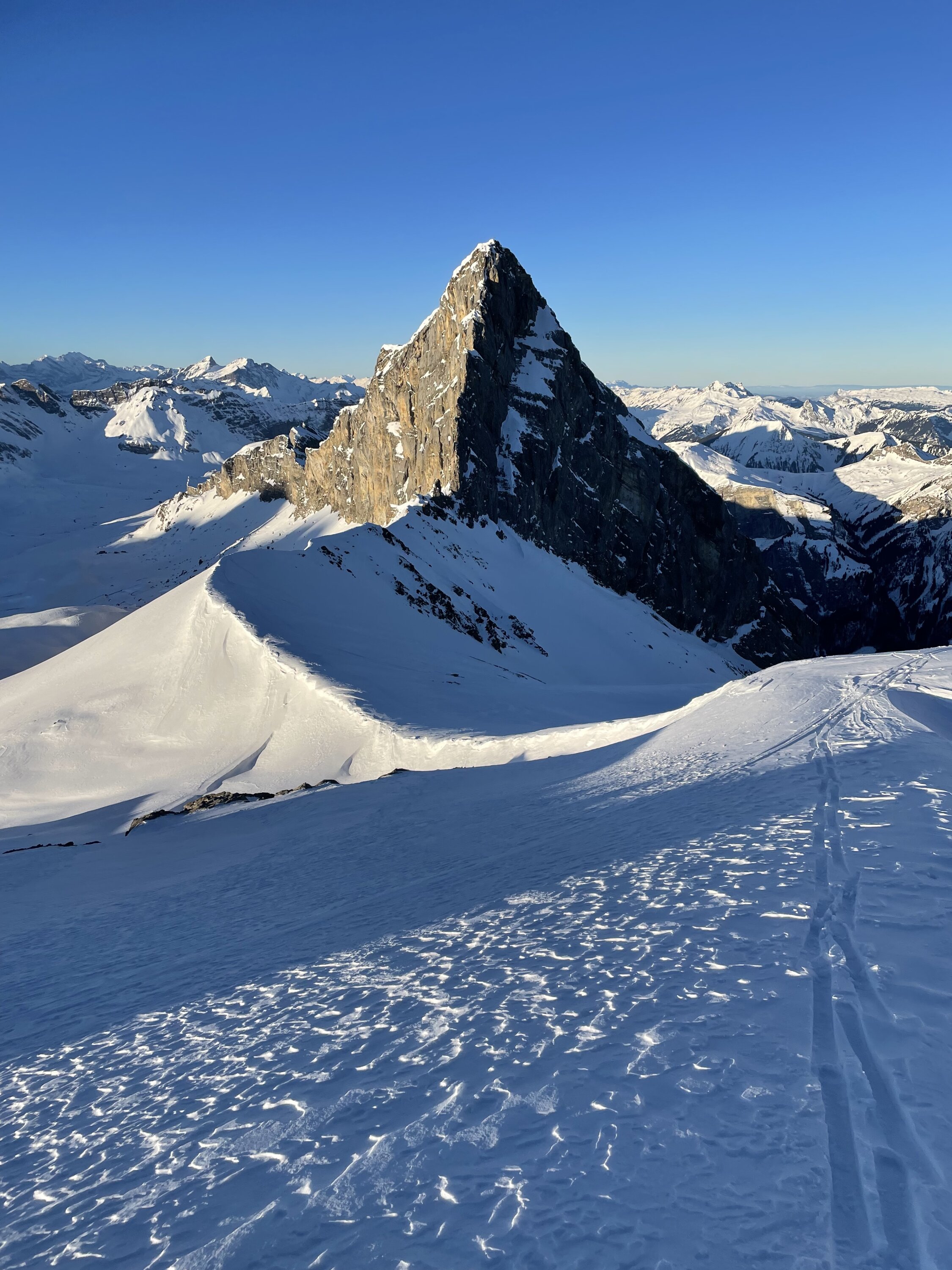 Via Piste auf den Bonistock und dann via Schneeschuhroute zur aufstiegsspur. Gute Spur, am Ende etwas glasig. Gipfel schneearm, daher skidepot 30 m unter dem Gipfel. Abfahrt auf der gleichen Route. Nord Abfahrt oben sicher top, unten raus aus meiner Sicht zu wenig Schnee und mir war mein Ski zu schade. Dafür danach noch auf die Hohmad bei tollem Wetter. Zum Sonnenaufgang jammern Traum am