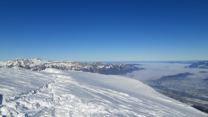 Geparkt in geräumter Parkbucht ca 1 km oberhalb Oberschan auf ca 800 Meter, keine Gebühr. Von da wenige Meter zum Beginn der Skiroute auf Fahrweg. Ausreichend Schnee ab Auto. Gute Spur bis Gipfel, keine Harscheisen. Abfahrt noch ziemlich pulvrig, Platz ist auch noch etwas.