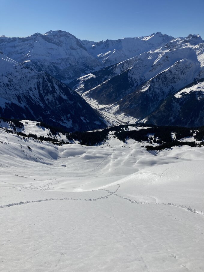 Die Tour ist gut eingespurt. Querung von Gipfelscharte zu den Nordabfahrten etwas vereist. In den Nordhängen noch schöner Pulver. Im Mühlibachtal auf der Foststrasse wird die Schneedecke stellenweise dann sehr dünn...