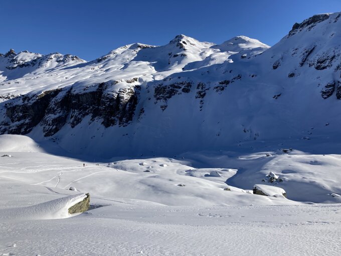 Aufstieg Wildmaaad - Vorderer Bliistock gut eingespurt. Abfahrt vom Bliistock Richtung Hübschboden schöner Pulverschnee. Von der Leglerhütte Richtung Chärpfscharte ist die Spur in den zu Südwesthänge Unter Chärpf etwas glasig und durchgefroren, Harscheisen sind von Vorteil. Auch die Chärpfscharte ist gut eingspurt, lediglich oben auf dem letzten Metern hat es einen vereistem Harschdeckel. Auf der Abfahrt Richtung Bischofalp schöner Pulverschnee.