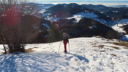 Die Südflanke vom Belchen weist nur eine geringe Schneehöhe auf, die unter der Sonneneinstrahlung der letzten Tage noch zusammengeschrumpft ist. Im Gipfelbereich durch den meist vorhandenen Windeinfluß ohnehin wenig Schnee. Der Ostwind sorgte auch bei dieser Tour wieder für ungemütliche Verhältnisse im Gipfelbereich. Im Windschatten dagegen angenehm zu sitzen.
