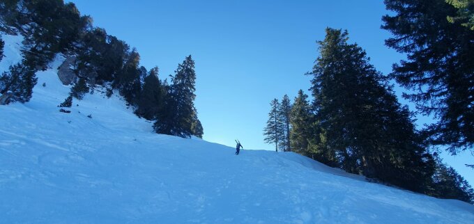 Harter verfahrener Schnee. Das Couloir resp Nadelöhr vor der letzten Kehre war nicht eisig aber war einfacher mit den Skiern auf dem Rücken zu meistern…
