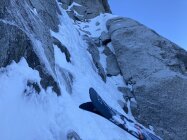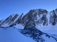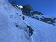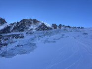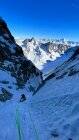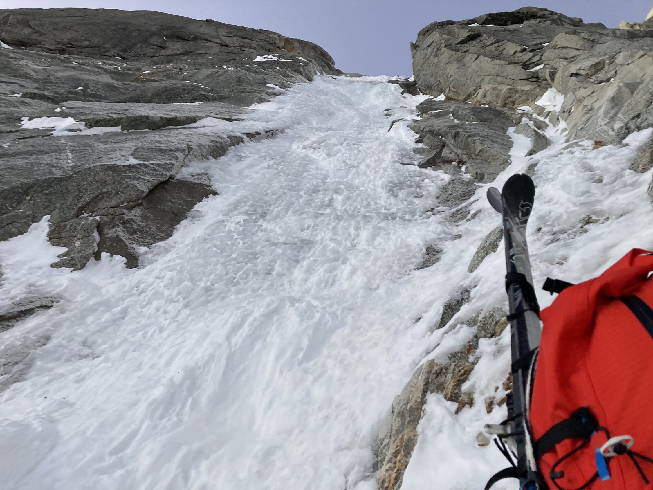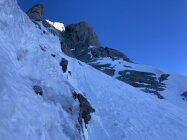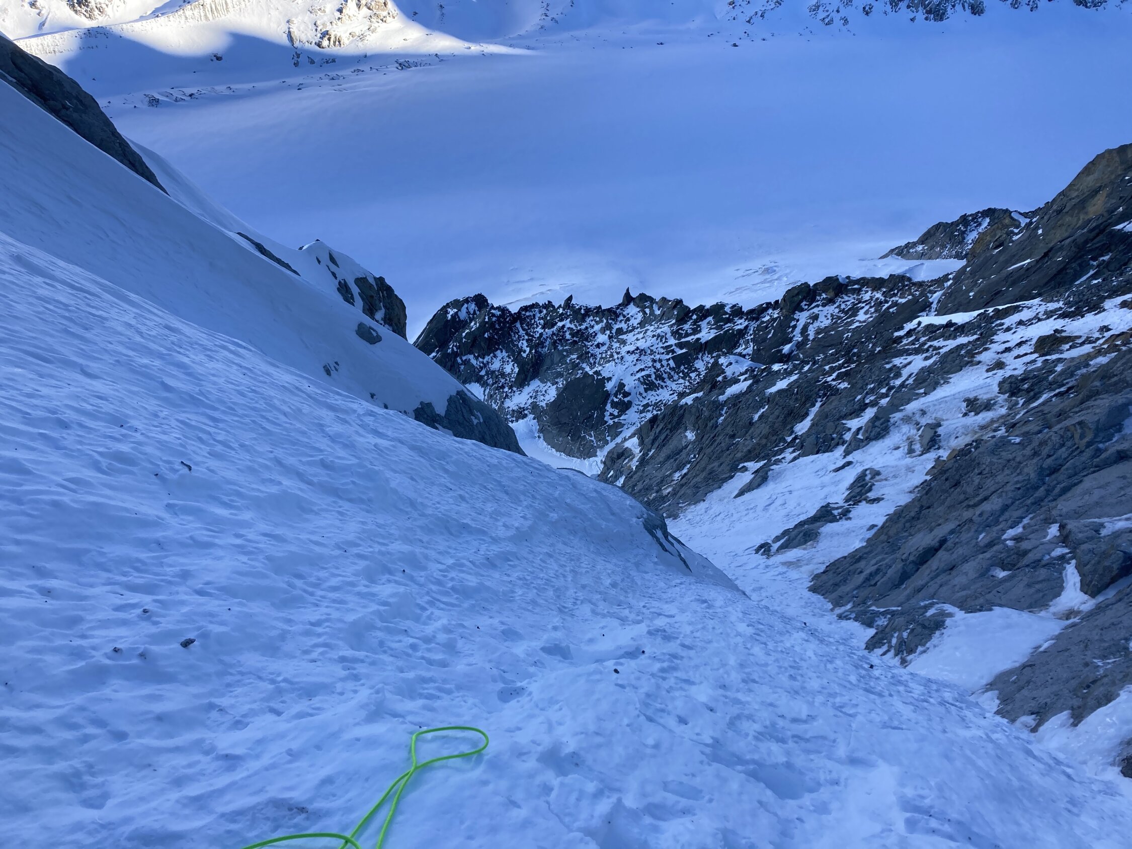 Zustieg ab Argentière Hütte mit Skiern. Bergschrund an einer Stelle heikel überquerbar (Übergang hat lustig geknackt…), danach ein paar Meter senkrechtes Gemisch aus Pow und Fels. Nachdem man sich da drübergewürgt hat recht gut, die ersten 400 hm sind anhaltend steil (bis 85 Grad), Eis zwischen gut griffig und hart. Danach 400hm 60 Grad Schneestapfen.