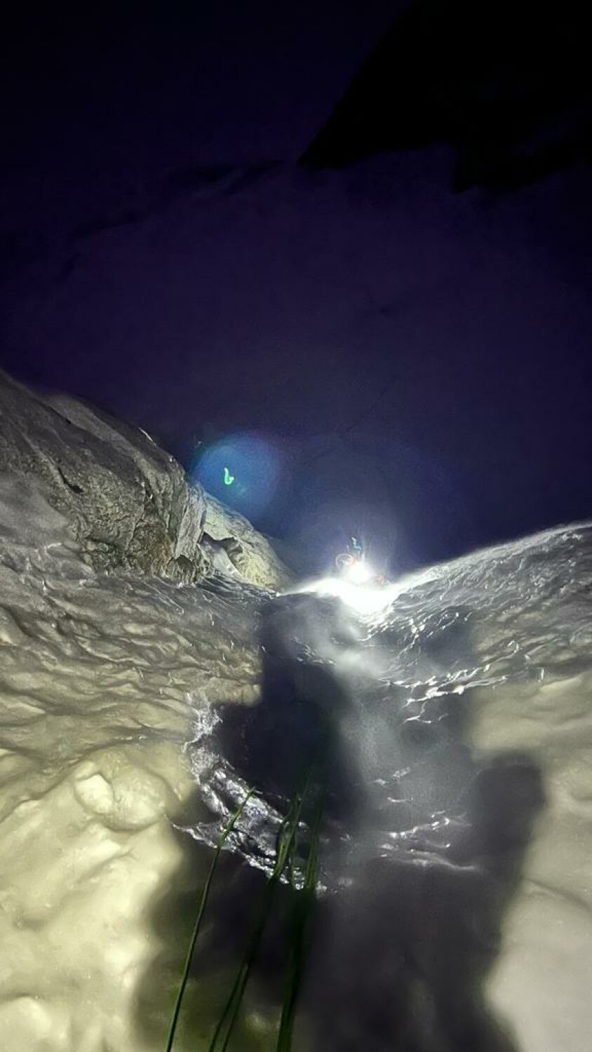 Abstieg den obersten Teil abgeseilt, danach das Vergnügen von Bruchharsch gehabt. Zwischen 2600 und 1800 ganz ok zu fahren, insgesamt im unteren Teil des Vallée Blanche (bereits deutlich vor Montenvers) sehr wenig Schnee, viele Steine. Sieht man im Dämmerlicht nicht alle aber hört man dafür;-).