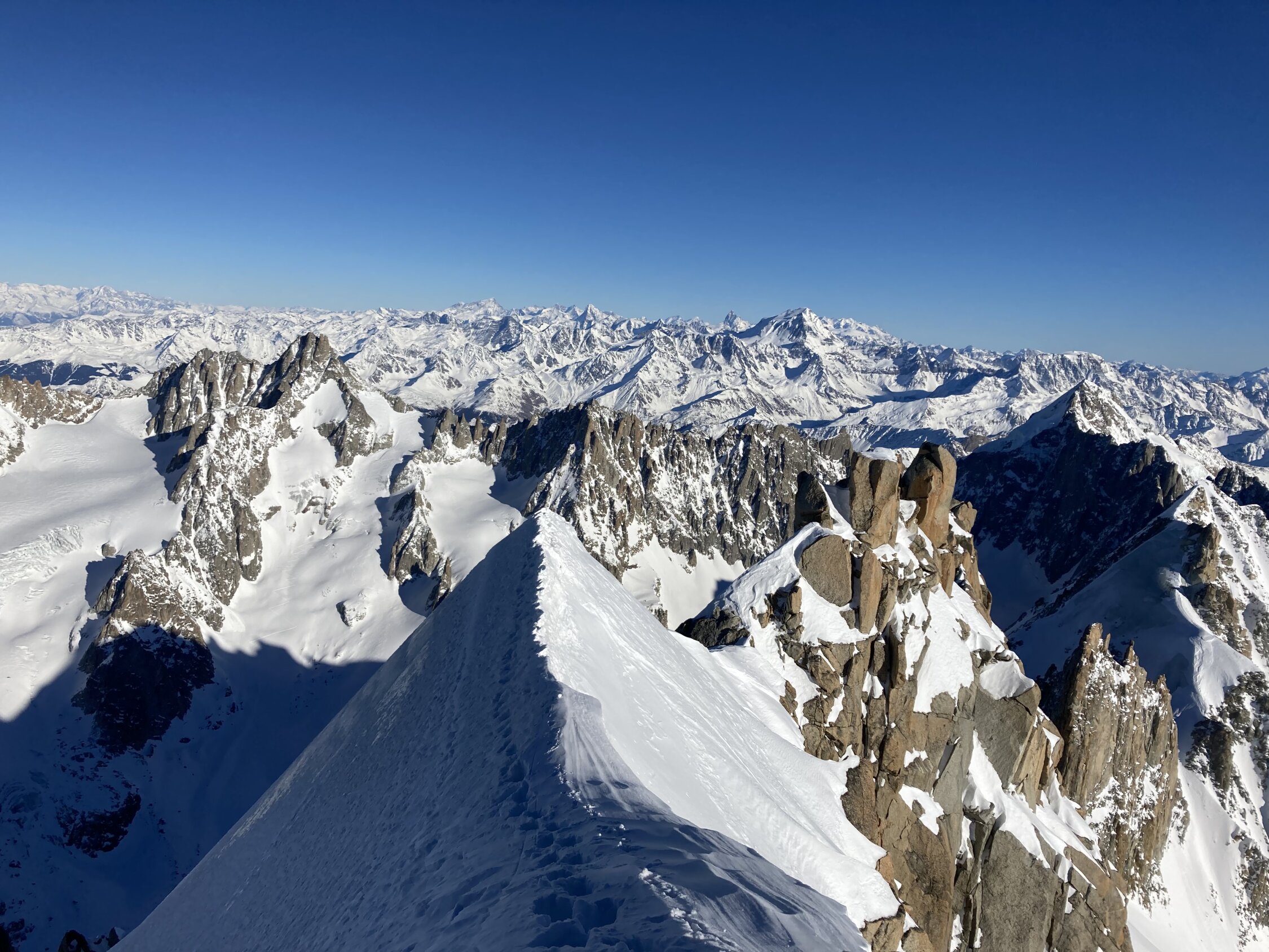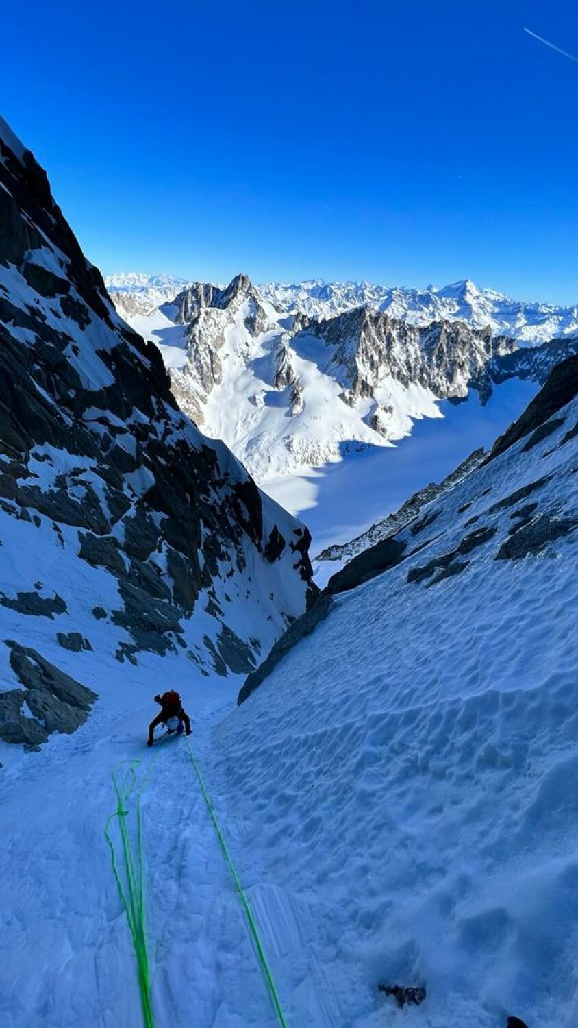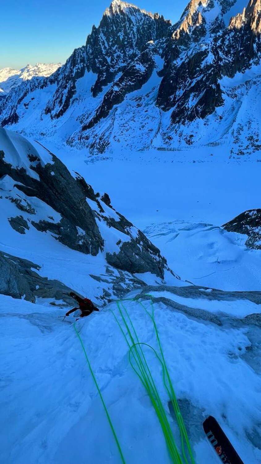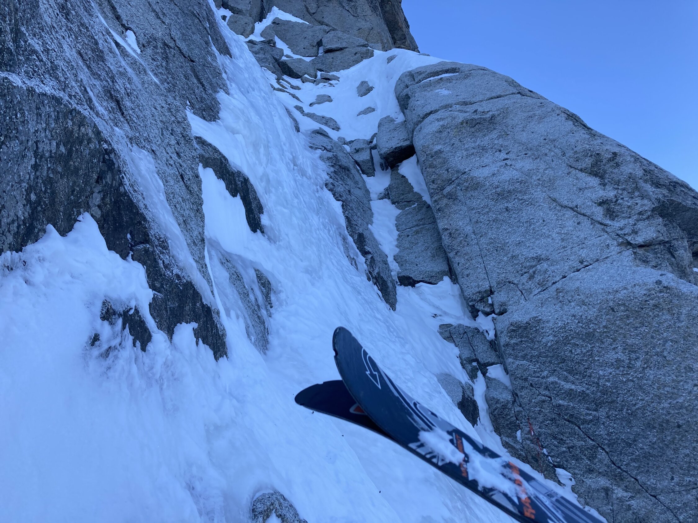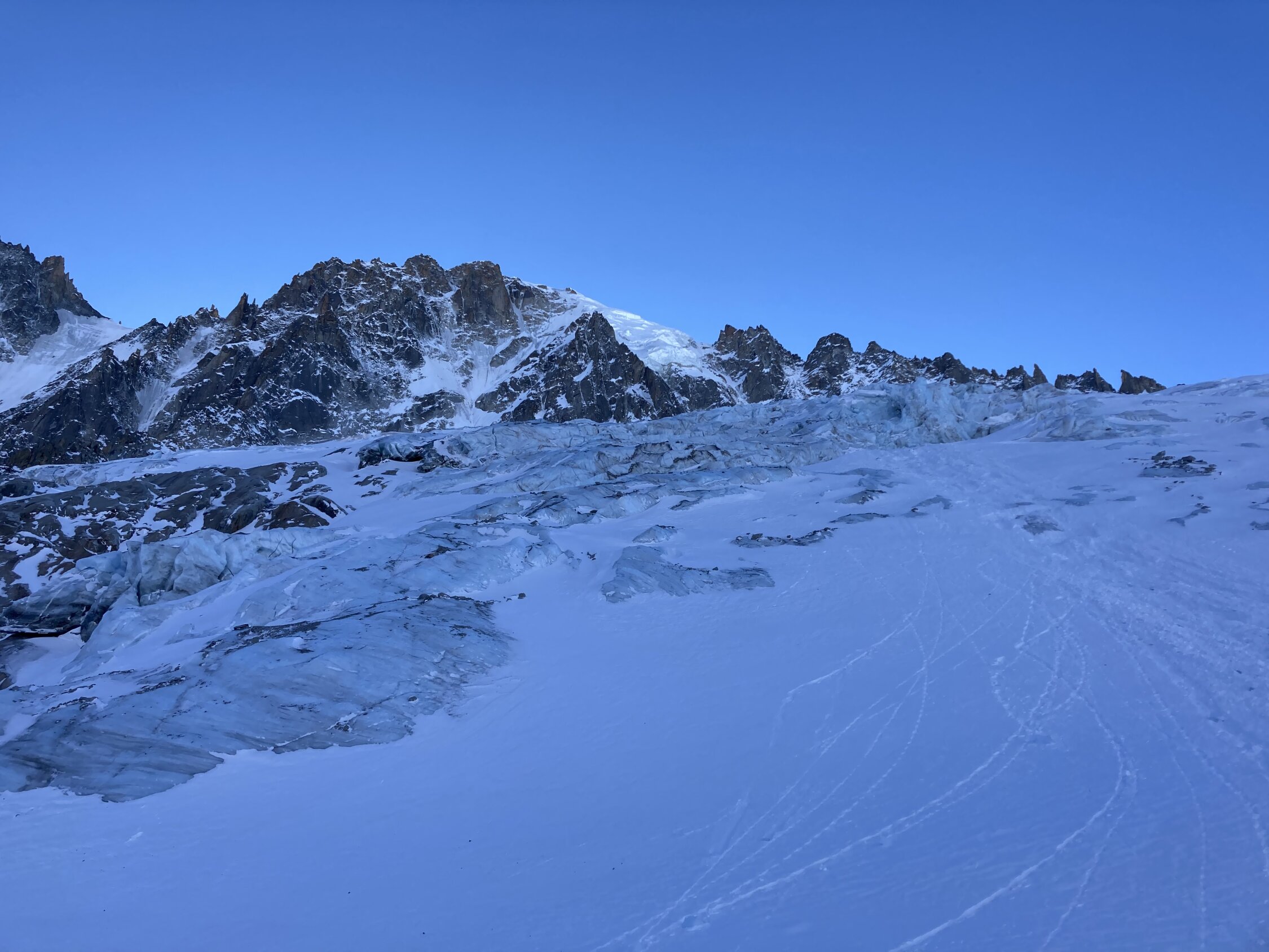 Technisch anhaltend fordernde Tour (zumindest für mich;-)), der Einstieg ein wenig typisch für Chamonix (nirgendwo sonst bisher diese Bergschrunddimensionen gesehen); bei den zwei anspruchsvolleren Stellen im Mixed Teil überlegt warum man sich sowas eigentlich antut;-); die Skier haben ein wenig gelitten, beim Aufstieg hatten sie im Mixed Teil viel Feindkontakt (und sind iwie auch gern im Weg), in der Abfahrt dann von unten. Besser als das unendlich lange Vallée Blanche abzulaufen ist’s allemal.