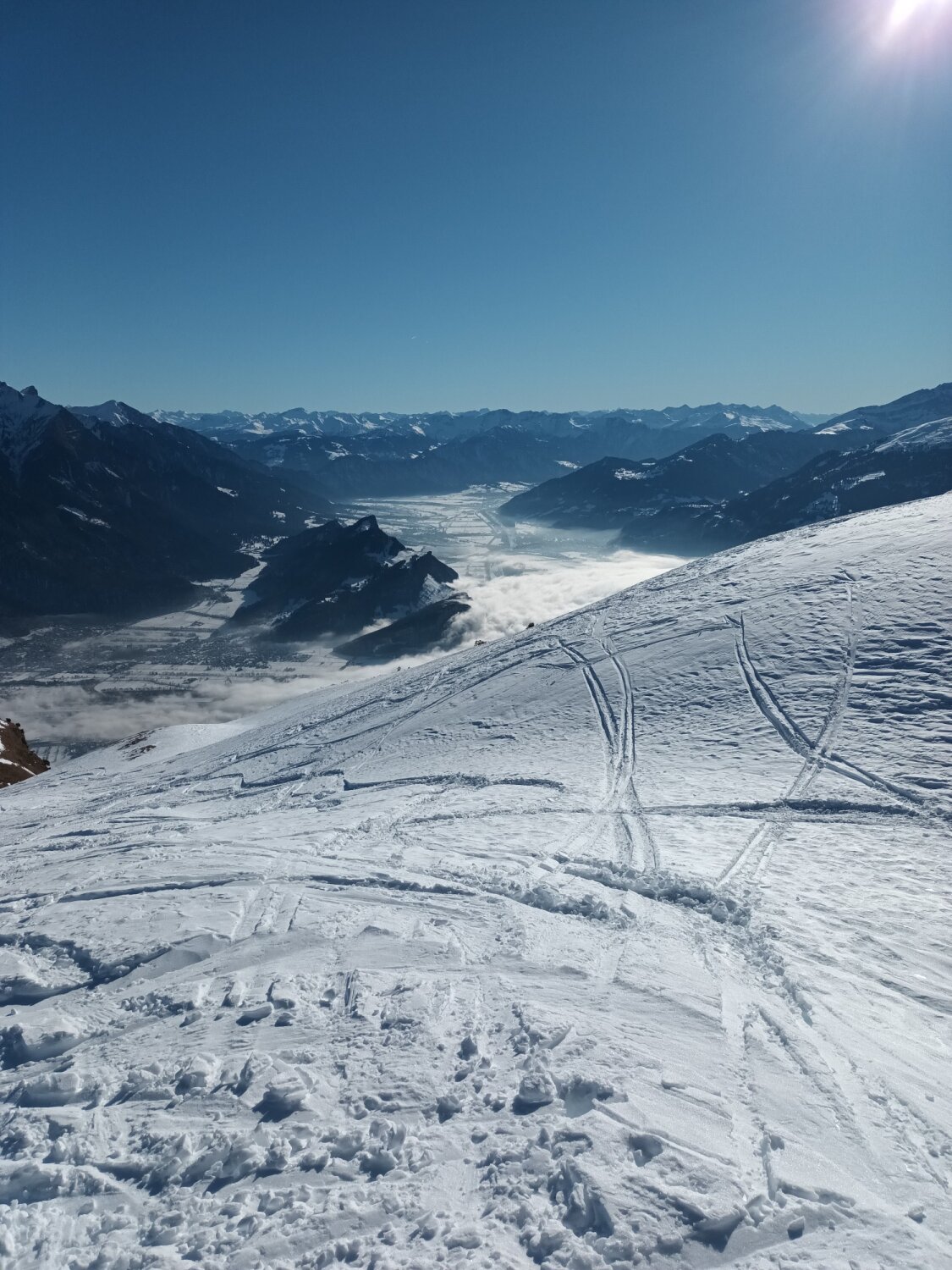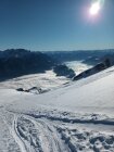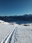 Im mittleren u. oberen Bereich gute Schneelage. Spur oben teilweise leicht eisig bzw. glasig - am steilen Gipfelhang waren heute Harscheisen sehr hilfreich. Bei Abfahrt bis Alpe Stofel noch gute Pulver-Varianten zu finden. Ansonsten bildet sich schon leichter Deckel in sonnenexponierten Flächen