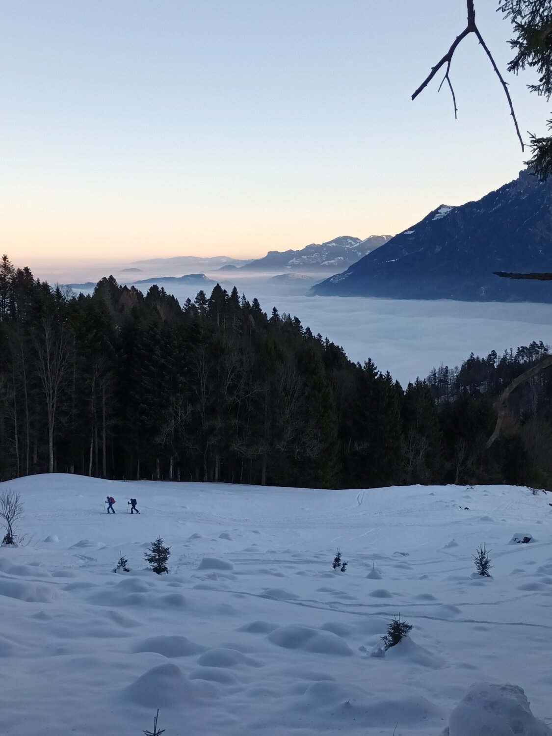 Ca 1km oberhalb von Oberschan kl.geräumter PP für wenige Autos. Direkt dort kann (noch) losgelaufen werden. Schnee auf dem ersten Wiesenhang u.auf Wald-/Güterweg für Aufstieg noch ausreichend - bei Abfahrt defensiv fahren.