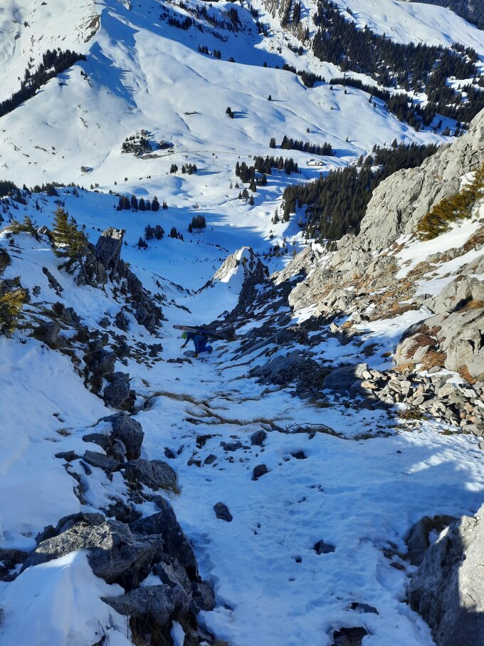 Wir sind ab Strasse am Lac d'Hongrain gestartet und über die Alpstrasse bis Pierre de Moelle.Aufstieg Flanke schöner Presspulfer,Couloir Windgepresster Schnee unregelmässig(Versuch Seitenarm dito) ,Ausstieg eisig hart.Weil bereits einige Spuren drin und Abfahrtsschne im Culi nicht top,Grat etwas Abgestiegen und von Nebengipfel durch Seitenculi runter.Einstieg kurz zu Fuss da Schneemangel,dann kurz hart,griffig,Rest und Flanke super Presspulfer.