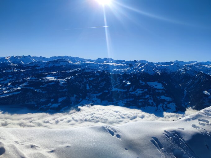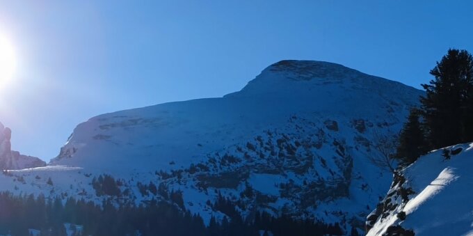 Oben sehr abgeblasen. Aber zu 80% des Gipfelhangs fahrbar, allerdings hart. Aufstieg zum Gipfel musste zu Fuss gemacht werden, wegen zu wenig Schnee.