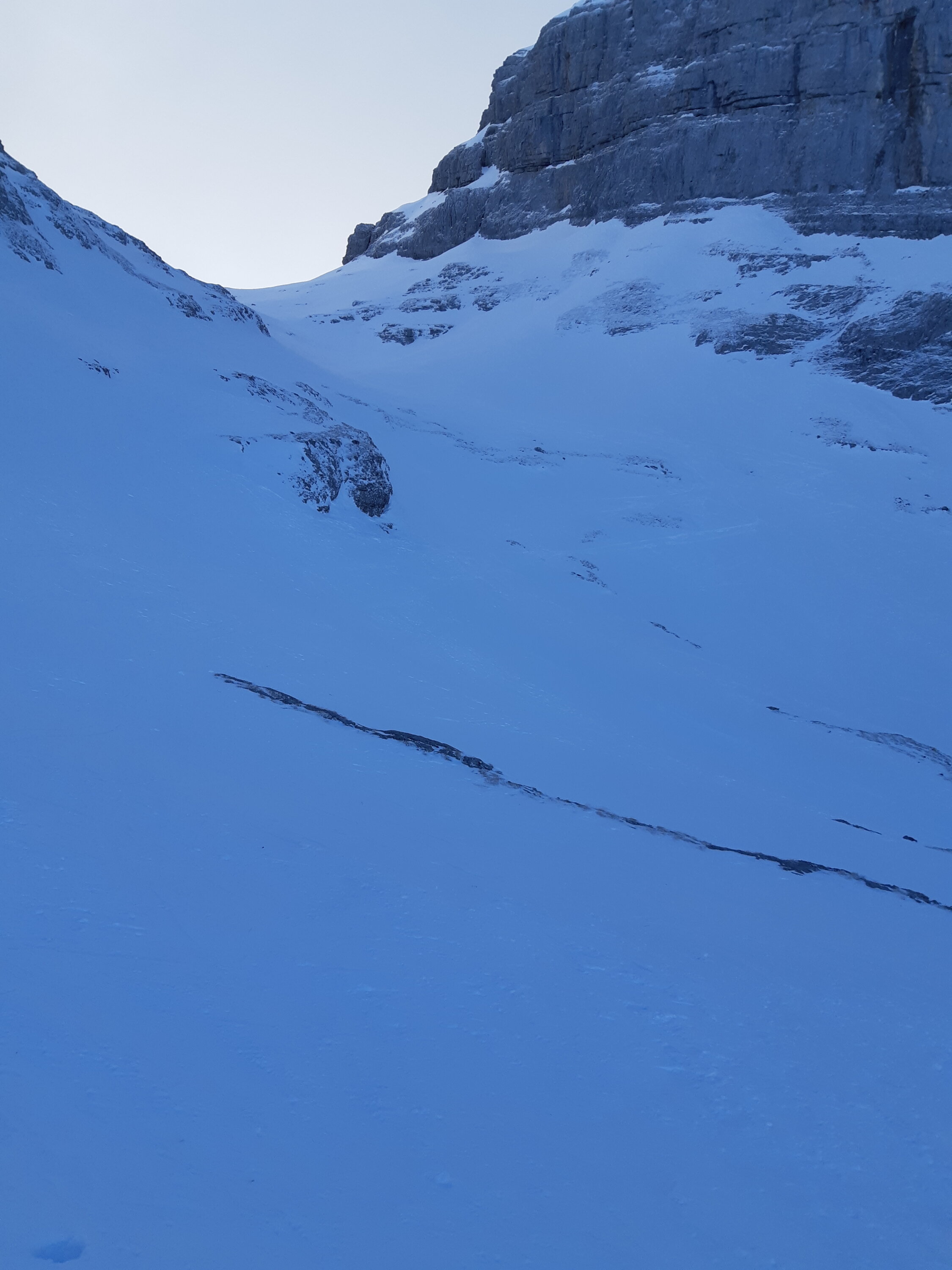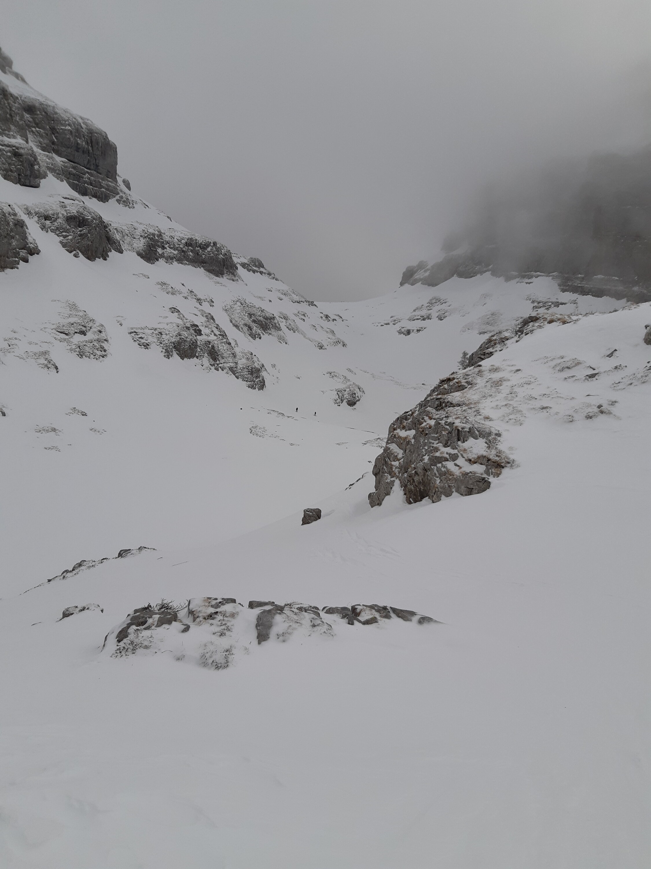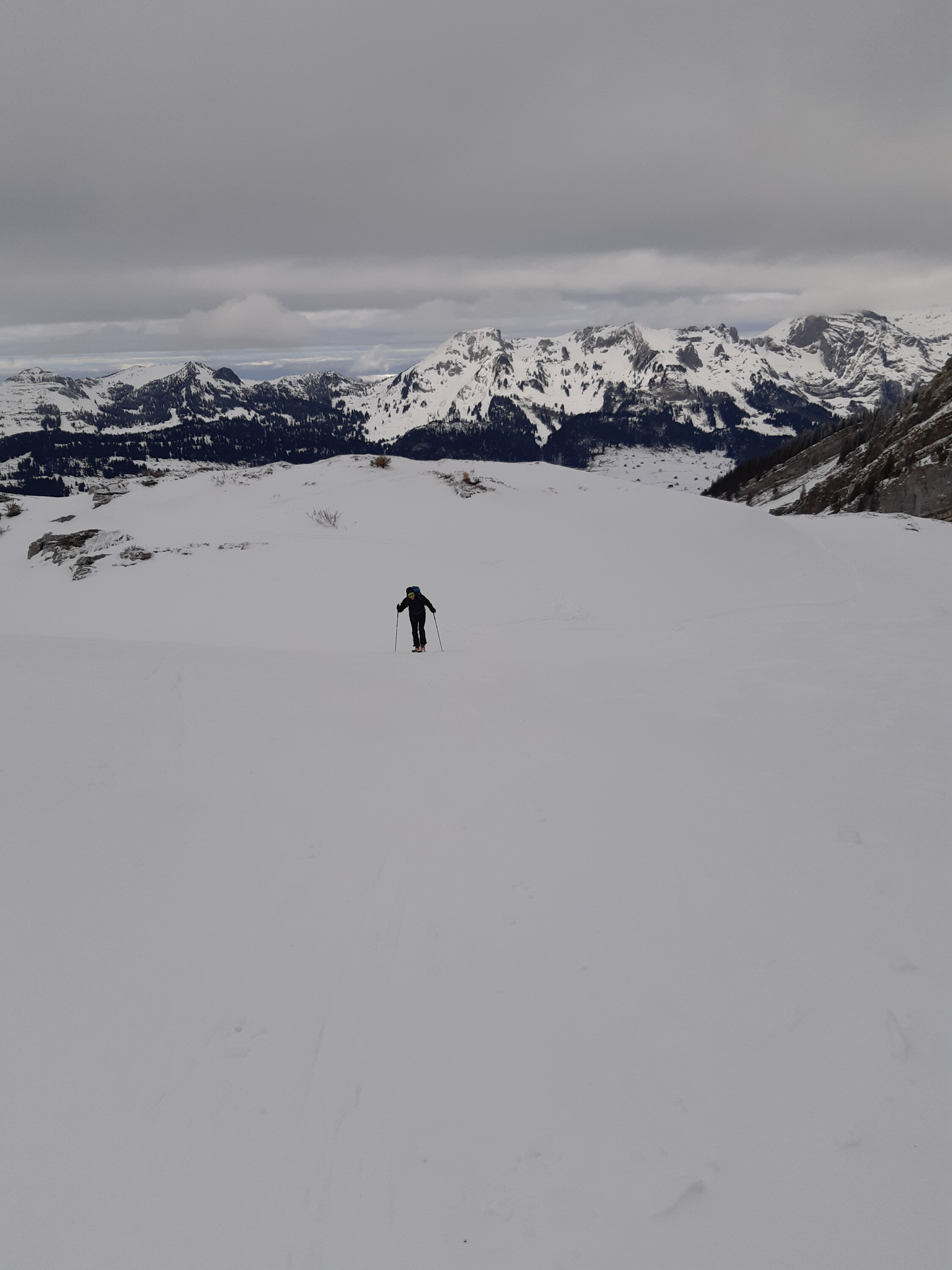 Oben windbearbeiteter Pulver aber ok zum fahren..Der Schlusshang dann ziemlich hart...Harscheisen hilfreich.