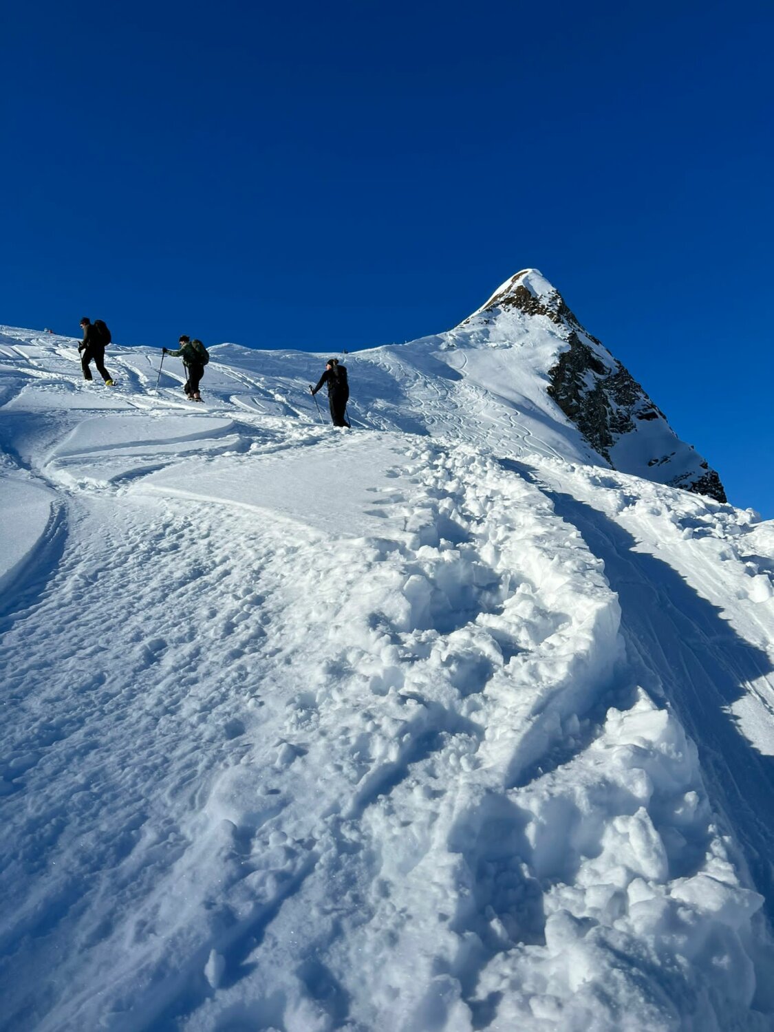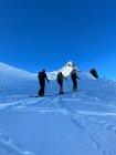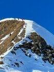 Gipfelgrat teilweise ausgesetzt und mit Drahtseil gesichert. Guter Trittschnee.