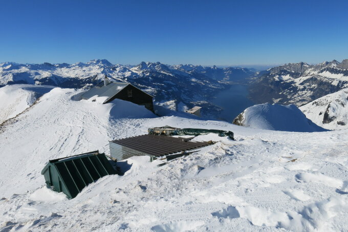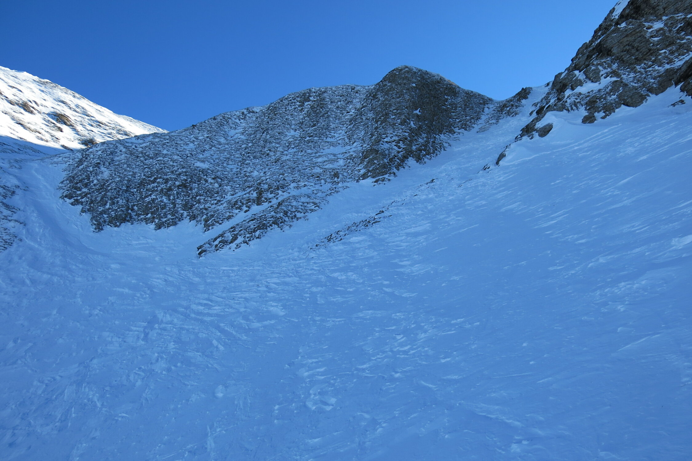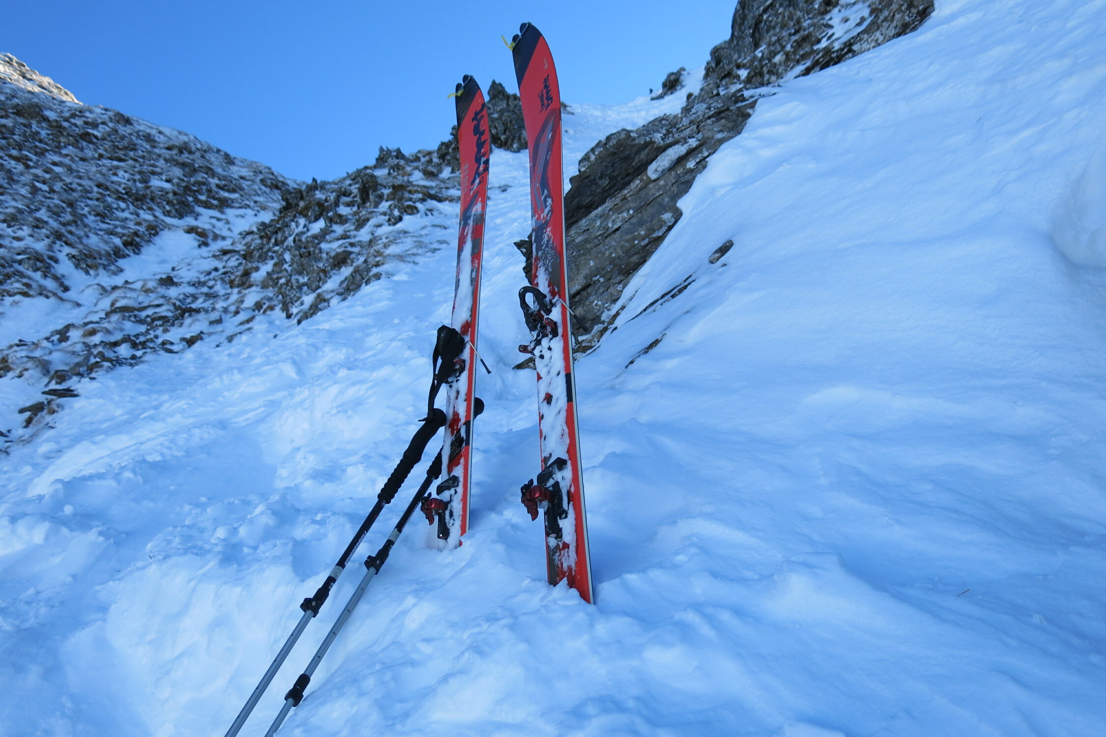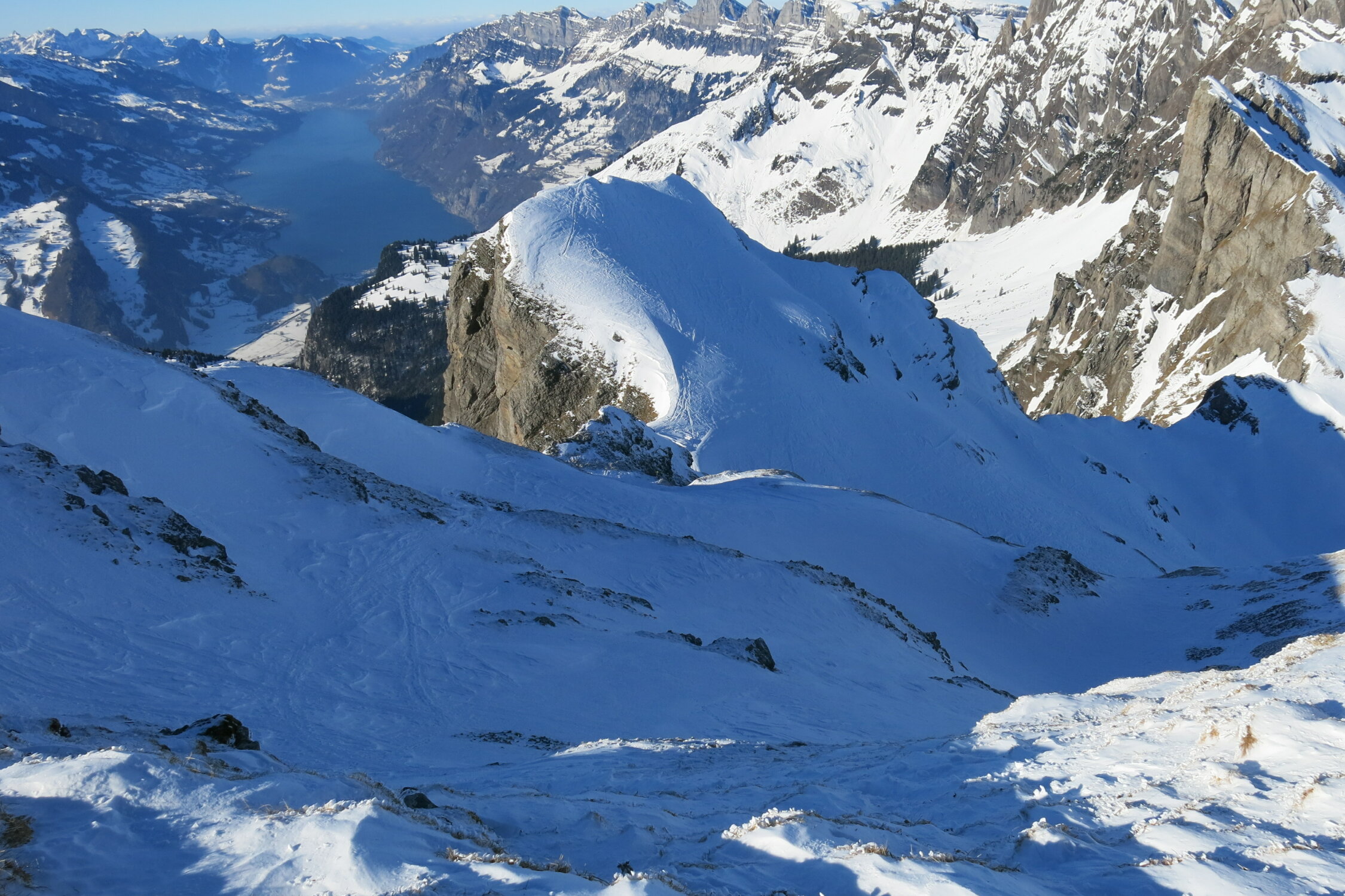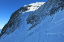 Habe die Ski unterhalb der Felsstufe deponiert und bin zu Fuss auf den Gipfel. Oben ziemlich abgeblasen. Es lohnt sich kaum mit den Ski bis oben zu gehen.
