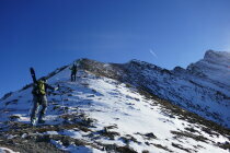 Vom Col de Forclaz zur Alp Les Prélayes. Von dort hinauf zur Croix des Prélayes, 2365m. Nun dem NW Grat hinauf zum Punkt 2417 und dem Grat weiter entlang bis zum Gipfel der Pointe Ronde. Es liegt fast kein Schnee auf dem Grat und man kann ihn mit etwas kraxeln gut machen mit den Skis auf dem Rucksack.