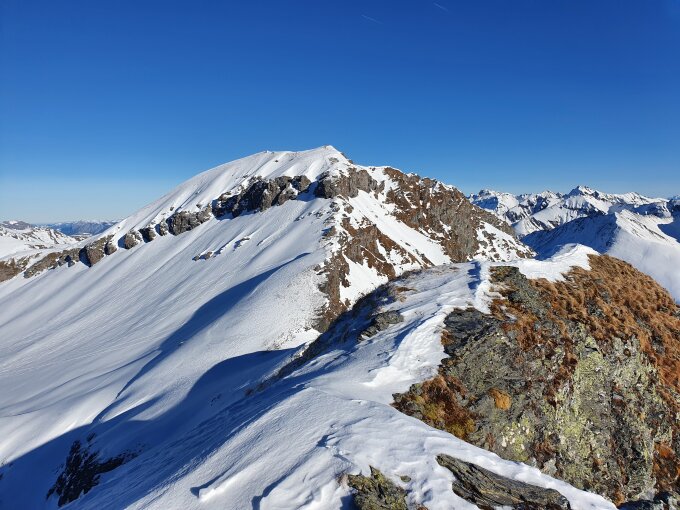 Es hat auf dem ganzen Forstweg genug Schnee bis Mittelstafel. Danach hatte es eine sehr gute Spur bis zum Gipfel.