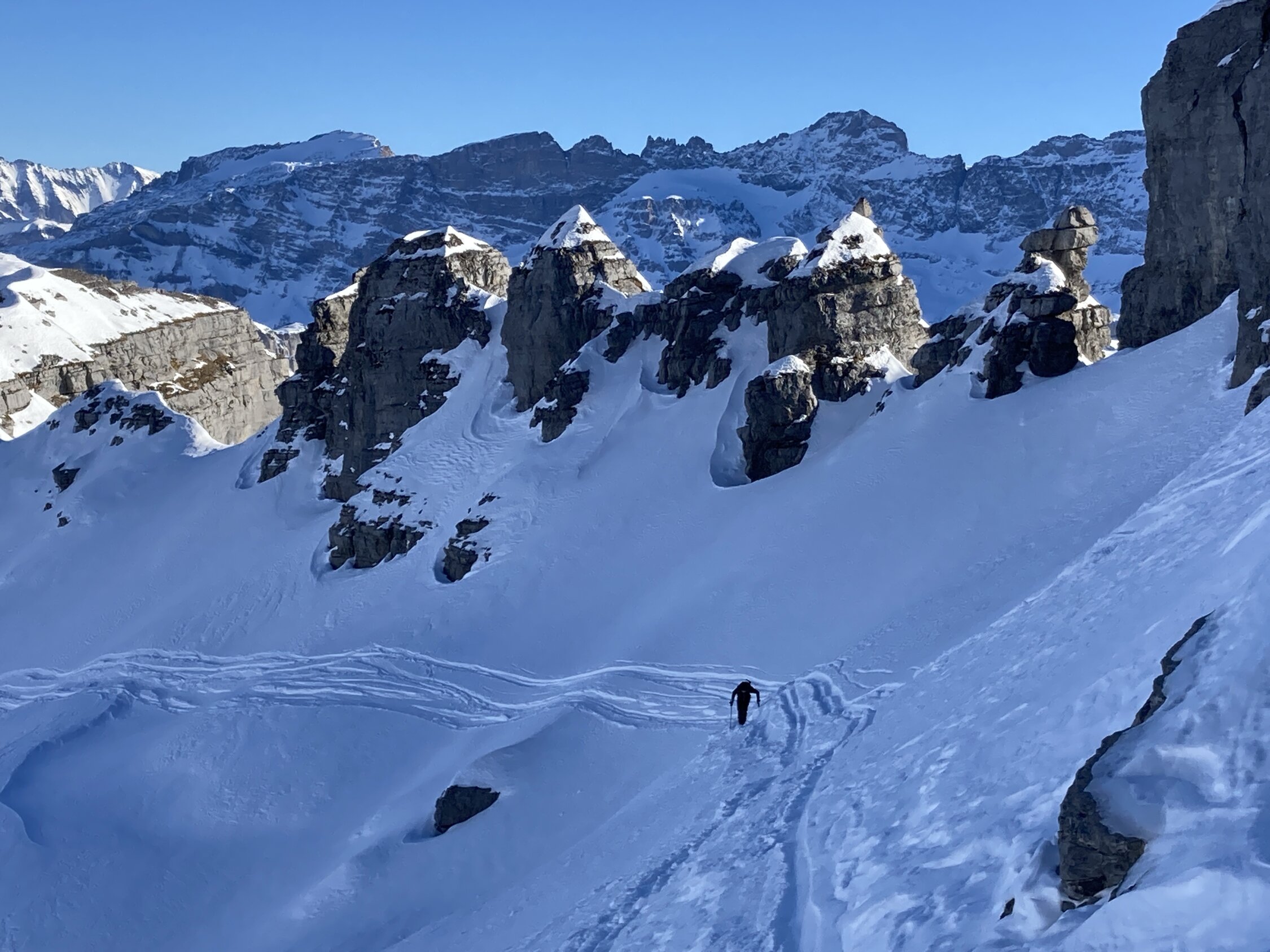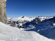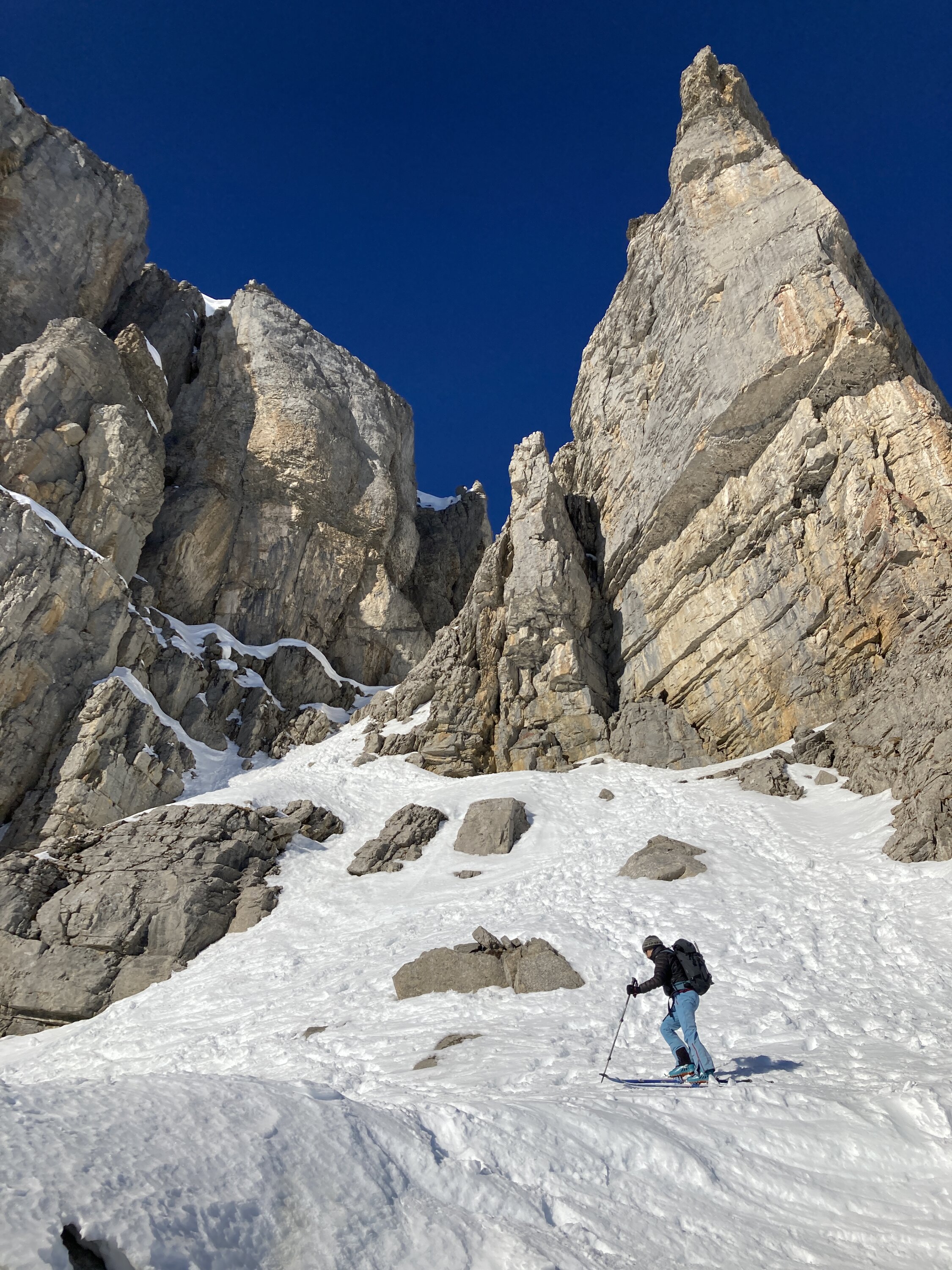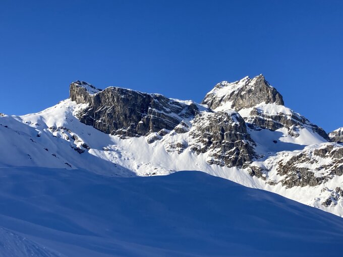 Der Grossteil der Route liegt im Schatten. Der Schnee ist meist pulverig. Nur an sonnenexponierten Stellen (im Aufstieg zum Couloir) etwas eisig. Das Couloir ist gut mit Schnee gefüllt. Gute Spur. Steigeisen ja, wenn es noch ganz gefroren ist. Für den Übergang vom Couloirende zum Gipfel ist es ratsam nicht auf der direkten Linie (Abfahrtsspuren) hochzusteigen, sondern zu beginn eher flach. Für den Schlussanstieg sind Harsteisen eine Unterstützung.