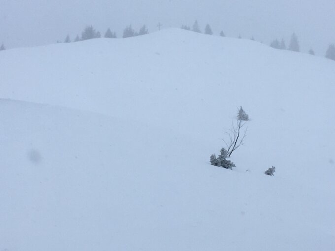 Neblig, Schneefall, bise. Trotzdem toll. Die 5cm NS haben Altspuren, Bollen usw gut egalisiert, so war Abfahrt durchaus ein Genuss!!