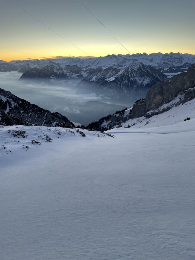 Wenig Schnee aber oben raus ausreichend bei umsichtiger Fahrweise. Mit dem Auto bis lütholdsmatt, schneeketten ohne Allradantrieb zur Sicherheit sicher im Auto haben. Wir haben sie benutzt. Zu Fuss bis all deneten, dann per Ski via sommerweg. Man sollte hier gut auf die Tageszeit achten. Toller Sonnenaufgang. Esel mit Steigeisen, ist empfehlenswert.