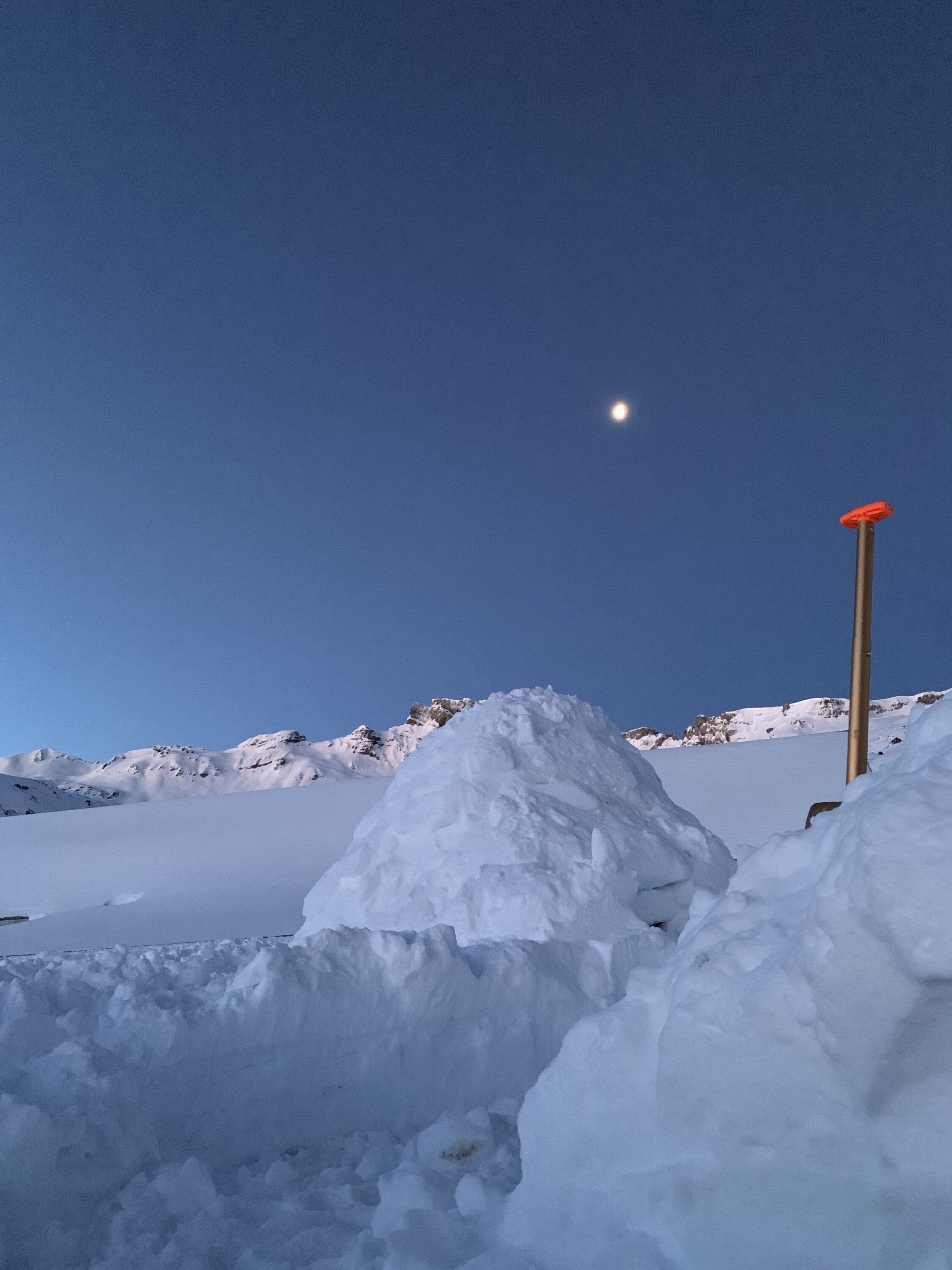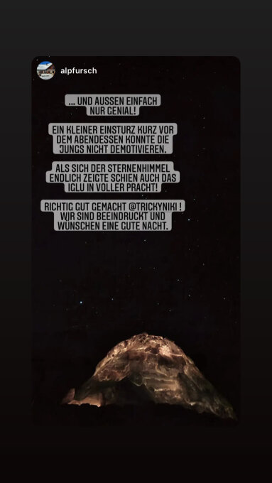 Gestern noch bedeckt, aber die Nacht sternenklar. Das draussen Schlafen hat sich gelohnt. Das Iglu bei der Alp Fursch ist ebenfalls Ready.