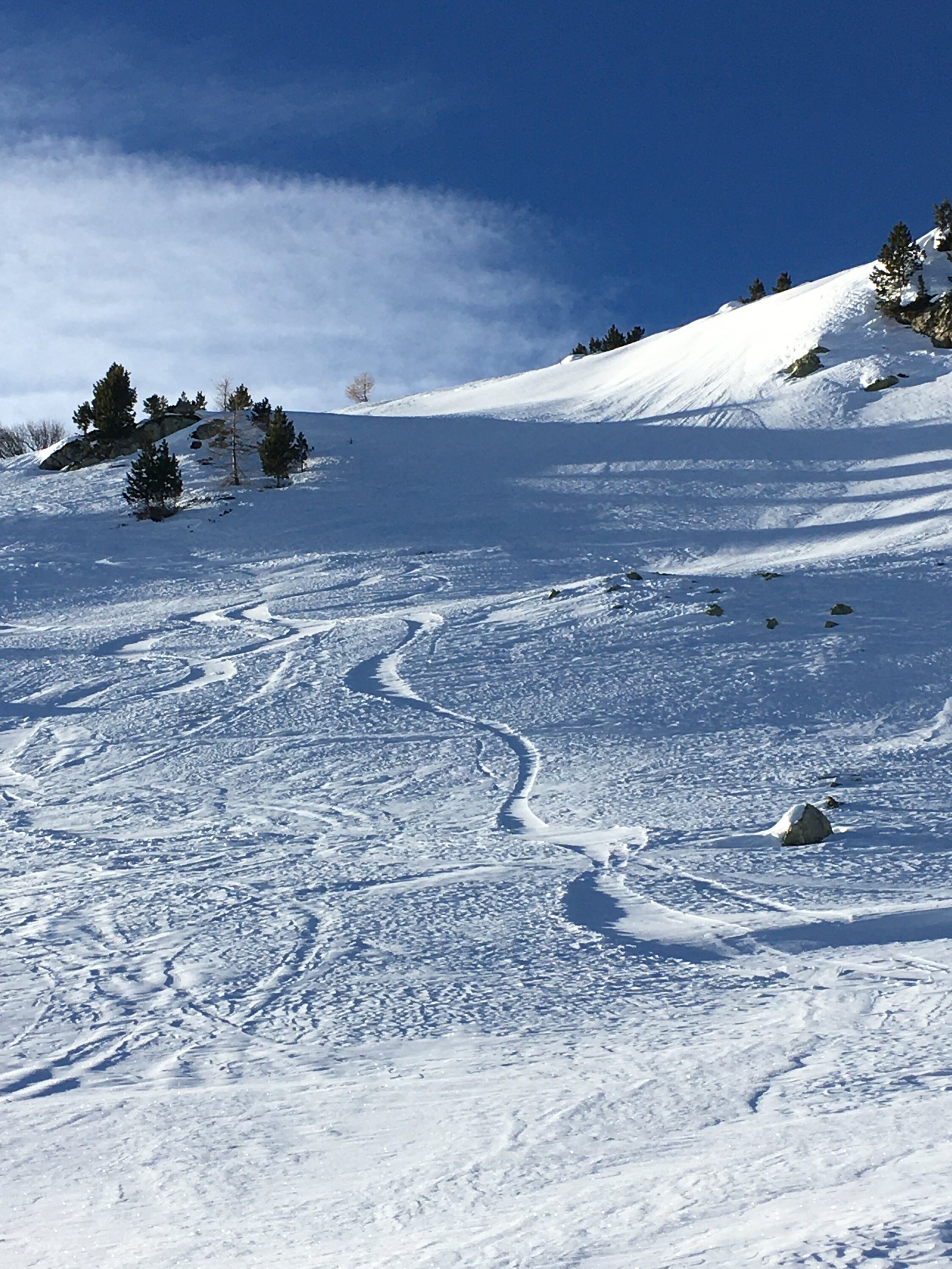 Start um 8.30 Parkplatz Diavolezza Talstation, minus 8 Grad, Nordwind. Die Spur auf die Diavolezza Bergstation führ ein kurzes Stück neben der Abfahrtspiste entlang. Ab Punkt 2157 in einiger Distanz in einem grossen Bogen in schönem Gelände zu Punkt 2364. Jetzt hatte es teilweise eine alte Spur die Nordostflanke hoch, im oberen Teil steil und mit dem Hartschnee sind Harscheisen notwendig. Kurz vor Punkt 2616 weniger steil. Der Punkt 2651 ist im Winter in der Wildruhezone und darf nicht begangen werden. Abfahrt in das steile Couloir Richtung Osten zu Punkt 2488 und weiter gemütlich auf der präparierter Piste zum Parkplatz Diavolezza. Im unteren Teil Pulverschnee, oben Bruchharst und Hartschnee.