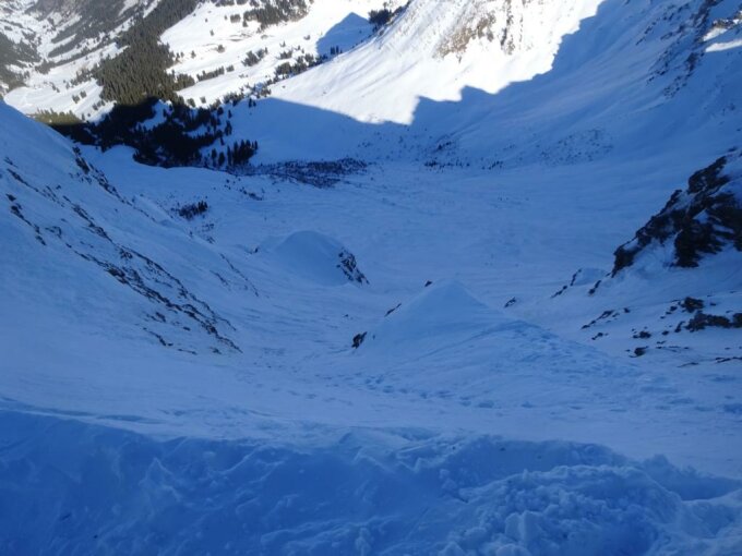 Die Abfahrt war besser als befürchtet. Vom Landvogtehorn zum Sattel pistenähnlich, der Steibodehang hatte windgepressten Schnee, der manchmal in grossen Kurven schön zu fahren war, manchmal auch etwas unberechenbar. Weiter unten noch Pulver, aber viele Spuren.