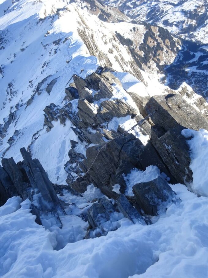Landvogtehorn hatte etwas mehr Betrieb (ca. 20 Leute), auf die Gsür und zurück waren wir jedoch alleine unterwegs. Schöner, luftiger Grat mit einer Kletterstelle drin, die zum Glück mit einem Fixseil gesichert ist. Der Schnee am Grat war nicht immer optimal, zwischendurch poröser Karton und der Pickel ist da ohne wirklich zu sichern abgesoffen. Vorsicht angesagt. Pickel und Steigeisen im Winter notwendig.