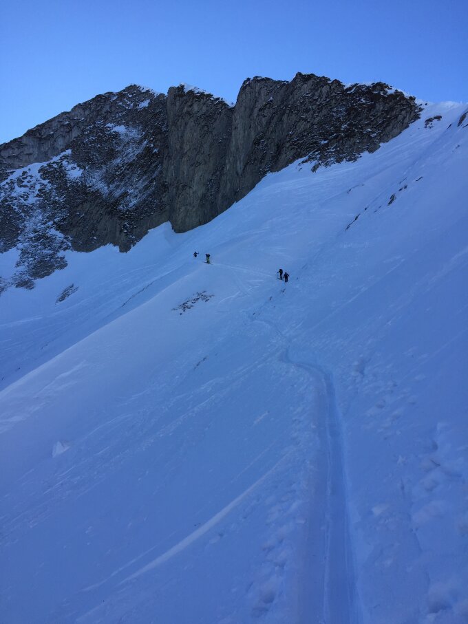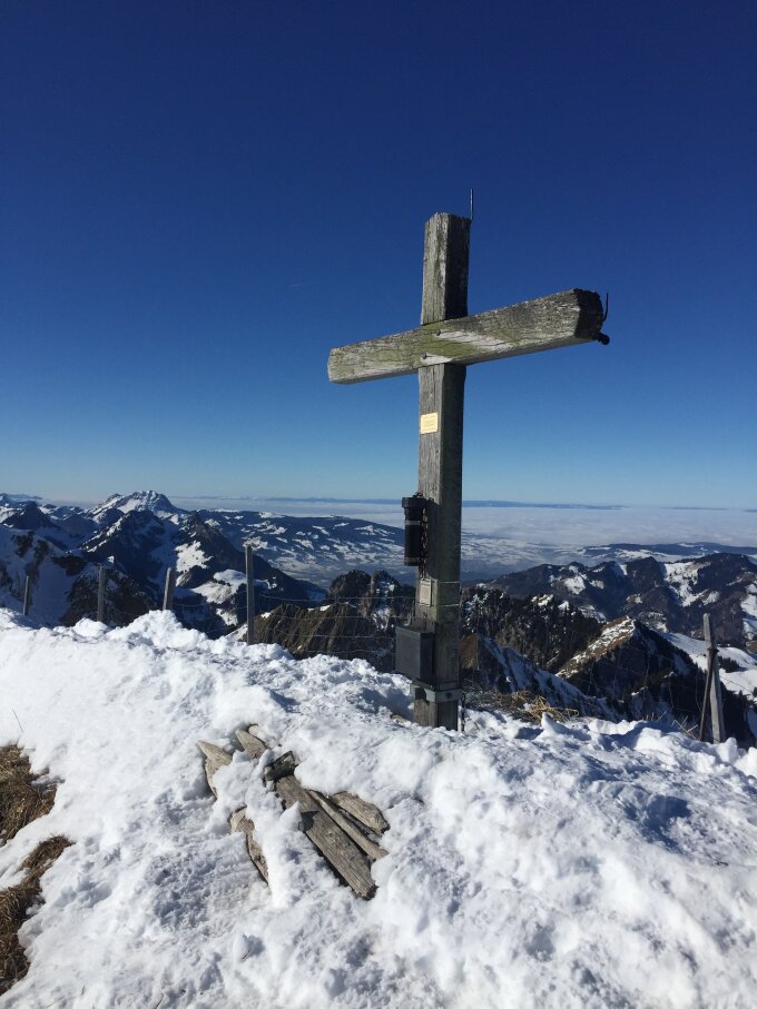 ab Schwarzsee-Bad ist das Strässchen in die Brecca durchgängig schneebedeckt. Ab Pt. 1489 direkt in südlicher Richtung den Wanderweg auf ca. 1650 erreichen. Über Combi zum Pass Pt. 2014. Zu Fuss zum Gipfel, gute Trittschneespur.