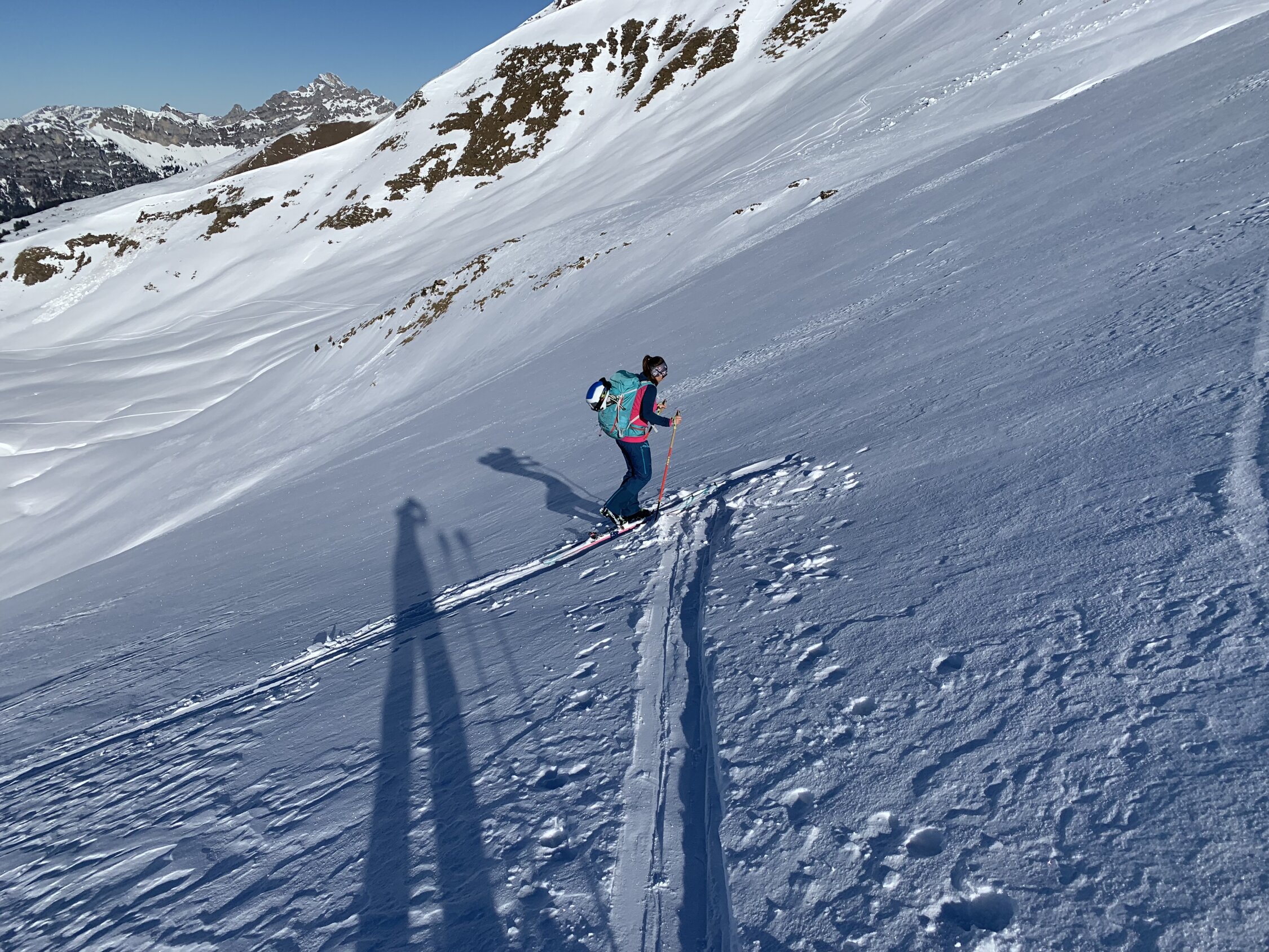 Schnee etwas unterhalb Laubbärgli. Aufstieg über das Strässchen im Sonnenschein. Schnee windgepresst oder eisig. Harscheisen deshalb im steilen Gipfelhang nützlich. Etwas Pulver in der Abfahrt gefunden.